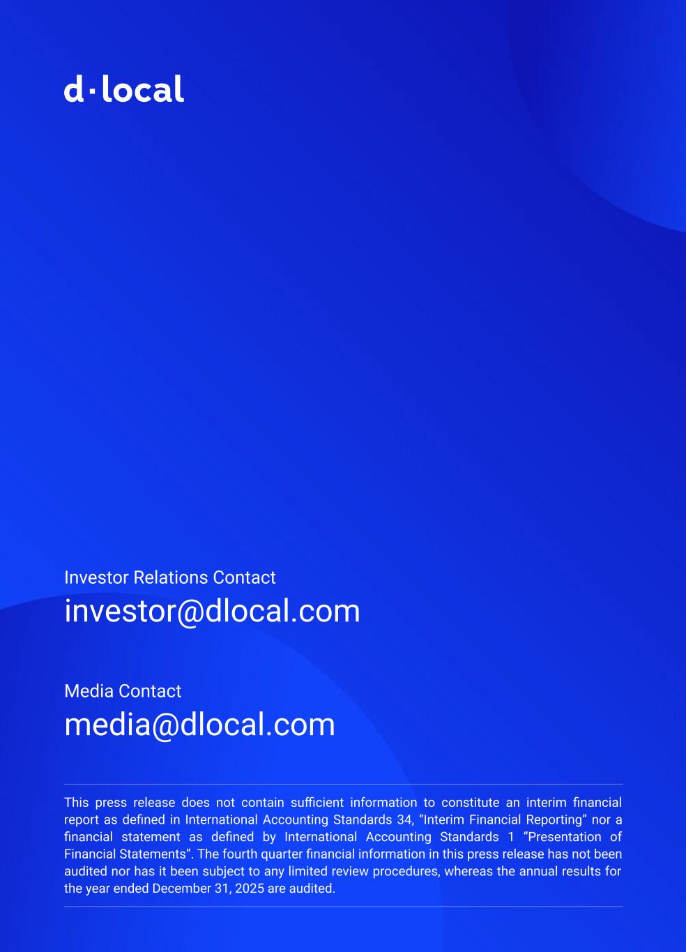 Investor Relations Contact investor@dlocal.com Media Contact media@dlocal.com This press release does not contain sufficient information to constitute an interim financial report as defined in International Accounting Standards 34, “Interim Financial Reporting” nor a financial statement as defined by International Accounting Standards 1 “Presentation of Financial Statements”. The fourth quarter financial information in this press release has not been audited nor has it been subject to any limited review procedures, whereas the annual results for the year ended December 31, 2025 are audited.