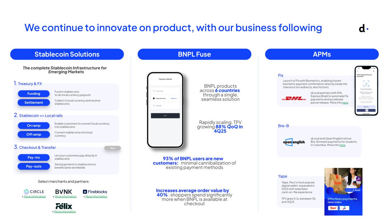 114Q25 Earnings Presentation ➔ We continue to innovate on product, with our business following Stablecoin Solutions APMsBNPL Fuse The complete Stablecoin Infrastructure for Emerging Markets Settlement Funding Fund in stablecoins to do local currency payouts 1. Treasury & FX Collect in local currency and receive stablecoins O ramp On ramp Enable customers to convert local currency into stablecoins 2. Stablecoin <> Local rails Convert stablecoins into local currency Pay-outs Pay-ins Let your customers pay directly in stablecoins 3. Checkout & Transfer Send payments in stablecoins to beneficiaries worldwide Select merchants and partners: + More information + More information + More information+ More information Launch of Pix with Biometrics, enabling instant biometric payment confirmation directly inside the checkout (no redirects, less friction). Pix Yape, Peru's most popular digital wallet, expanded in 2025 with tokenized card-on-file experience TPV grew 5.5× between 1Q and 4Q25 Yape Bre-B dLocal and Open English roll out Bre-B instant payments for students in Colombia. More info here. Rapidly scaling, TPV growing 88% QoQ in 4Q25 dLocal partners with DHL Express Brazil to automate Pix payments and accelerate parcel release. More info here. 93% of BNPL users are new customers: minimal cannibalization of existing payment methods Increases average order value by 40% : shoppers spend significantly more when BNPL is available at checkout New BNPL products across 6 countries through a single, seamless solution