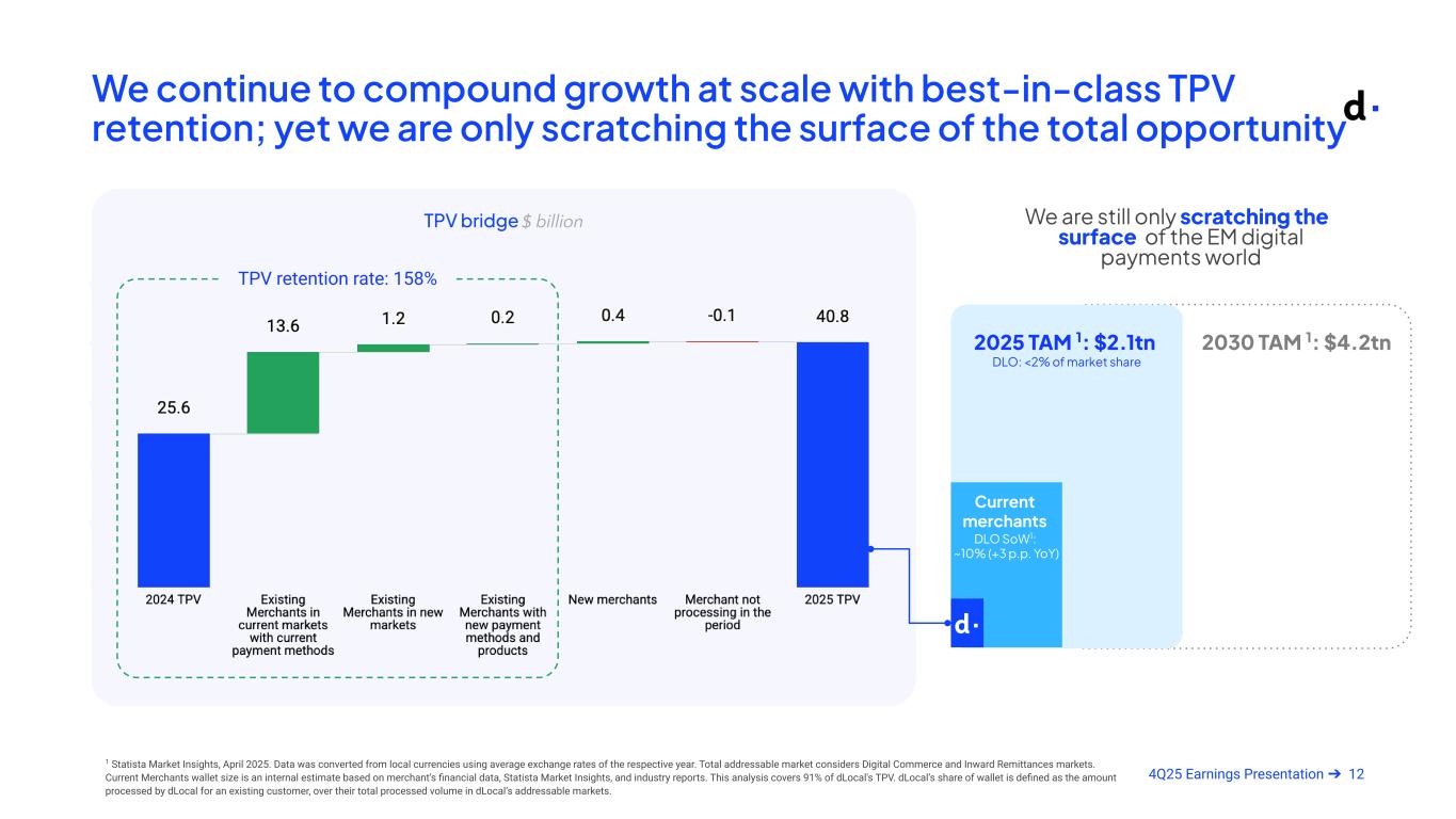 124Q25 Earnings Presentation ➔ We continue to compound growth at scale with best-in-class TPV retention; yet we are only scratching the surface of the total opportunity TPV bridge $ billion TPV retention rate: 158% 1 Statista Market Insights, April 2025. Data was converted from local currencies using average exchange rates of the respective year. Total addressable market considers Digital Commerce and Inward Remittances markets. Current Merchants wallet size is an internal estimate based on merchant’s financial data, Statista Market Insights, and industry reports. This analysis covers 91% of dLocal's TPV. dLocal’s share of wallet is defined as the amount processed by dLocal for an existing customer, over their total processed volume in dLocal’s addressable markets. We are still only scratching the surface of the EM digital payments world 2025 TAM 1: $2.1tn DLO: <2% of market share Current merchants 2030 TAM 1: $4.2tn DLO SoW1: ~10% (+3 p.p. YoY)