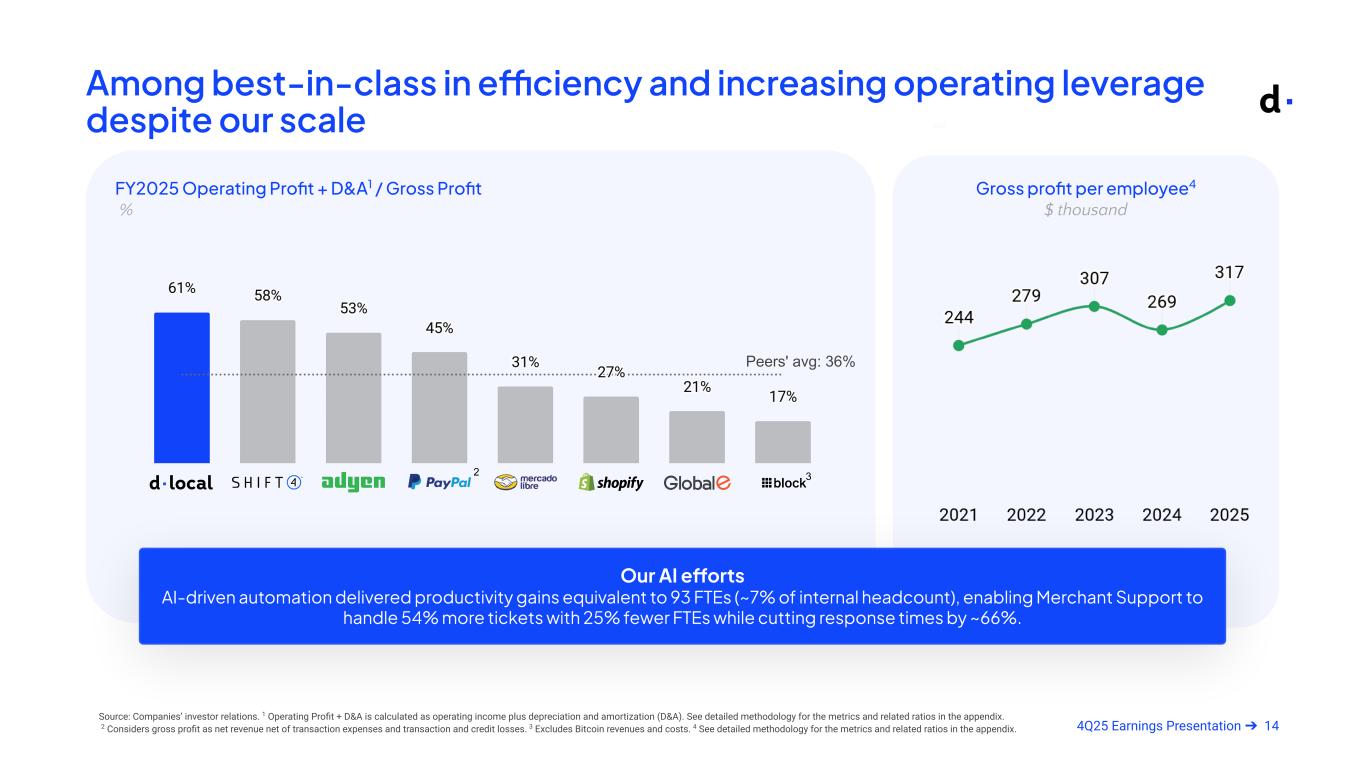 144Q25 Earnings Presentation ➔ Among best-in-class in efficiency and increasing operating leverage despite our scale FY2025 Operating Profit + D&A1 / Gross Profit % Our AI e orts AI-driven automation delivered productivity gains equivalent to 93 FTEs (~7% of internal headcount), enabling Merchant Support to handle 54% more tickets with 25% fewer FTEs while cutting response times by ~66%. Peers' avg: 36% Source: Companies’ investor relations. 1 Operating Profit + D&A is calculated as operating income plus depreciation and amortization (D&A). See detailed methodology for the metrics and related ratios in the appendix. 2 Considers gross profit as net revenue net of transaction expenses and transaction and credit losses. 3 Excludes Bitcoin revenues and costs. 4 See detailed methodology for the metrics and related ratios in the appendix. 2 3 Gross profit per employee4 $ thousand