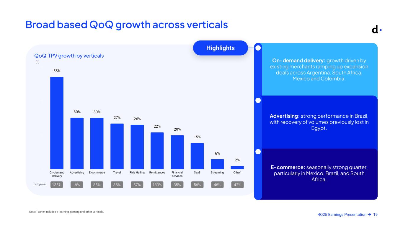 194Q25 Earnings Presentation ➔ Broad based QoQ growth across verticals Note: 1 Other includes e-learning, gaming and other verticals. QoQ TPV growth by verticals % On-demand delivery: growth driven by existing merchants ramping up expansion deals across Argentina. South Africa, Mexico and Colombia. Advertising: strong performance in Brazil, with recovery of volumes previously lost in Egypt. E-commerce: seasonally strong quarter, particularly in Mexico, Brazil, and South Africa. Highlights 135% -6% 85% 35% 57% 139% 35% 56% 46% 42%YoY growth
