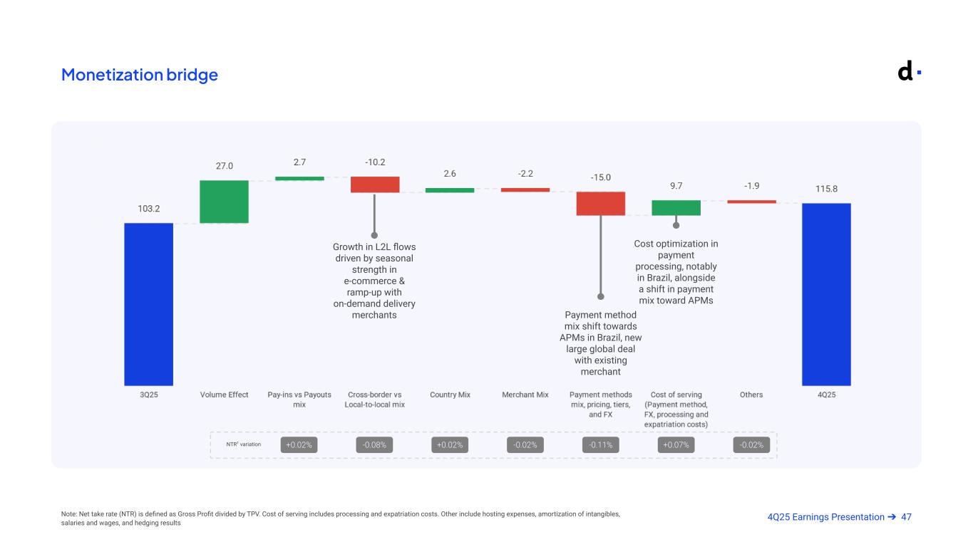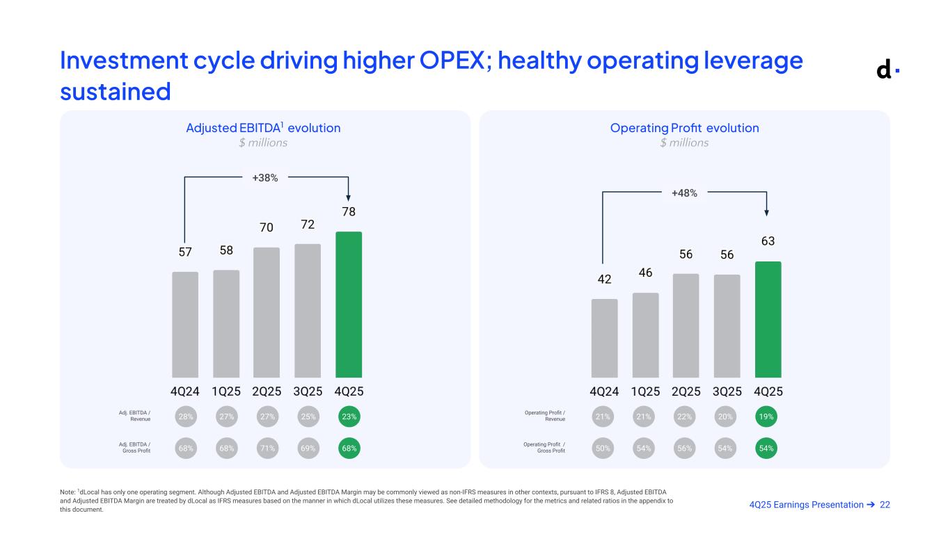 174Q25 Earnings Presentation ➔ 4Q25: ending the year with strong growth momentum, with broad-based acceleration across key metrics TPV surpassed $13B for the first time, with record highs across all products (PIs, POs) and flows (XB, L2L). US$13.1B ▲+70% YoY ▲+26% QoQ TPV Solid free cash generation. Adjusted FCF to net income ratio at 117%. US$65M ▲+100% YoY ▲+73% QoQ Adjusted Free cash flow (Adj. FCF)2 Sustained best-in-class operating leverage with disciplined expense management. Adjusted EBITDA / Gross Profit Ratio: 68% Operating Profit / Gross Profit Ratio: 54% US$78M ▲+38% YoY ▲+9% QoQ Adjusted EBITDA2 QoQ growth driven by broad-based volume growth and partial recovery of volumes in Egypt, partially offset by margin pressure in Argentina. US$116M ▲+38% YoY ▲+12% QoQ Gross profit Strong growth driven by higher operating profit and lower income tax expenses. Diluted EPS: $0.18 (vs $0.17 in 3Q25) US$56M ▲+87% YoY ▲+7% QoQ Net income QoQ increase driven by volume growth. US$338M ▲+65% YoY ▲+20% QoQ Revenue ▲+64% YoY CC1 ▲+69% YoY CC1 ▲+34% YoY CC1 Note: 1 Constant currency growth. Please refer to the appendix titled "Reconciliation of TPV, Revenue and Gross profit constant currency measures to reported results" for the corresponding reconciliation. 2 See detailed methodology for the metrics and related ratios in the appendix to this document. Armado Mar 11 @ 9pm Operating Profit US$ 63M ▲+48% YoY