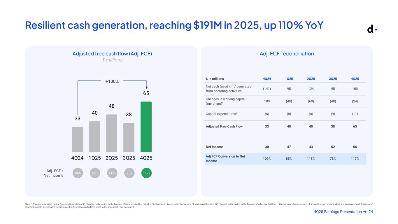 244Q25 Earnings Presentation ➔ Resilient cash generation, reaching $191M in 2025, up 110% YoY Adj. FCF / Net income +100% 117%73%109% 85% 113% Adj. FCF reconciliation $ in millions 4Q24 1Q25 2Q25 3Q25 4Q25 Net cash (used in ) / generated from operating activities (141) 95 124 95 100 Changes in working capital (merchant)¹ 180 (48) (68) (48) (24) Capital expenditures² (6) (8) (8) (9) (11) Adjusted Free Cash Flow 33 40 48 38 65 Net income 30 47 43 52 56 Adj FCF Conversion to Net Income 109% 85% 113% 73% 117% Note: 1 Changes in working capital (merchant) consists of (i) changes in the period in the balance of trade receivables net, plus (ii) changes in the period in the balance of trade payables, plus (iii) changes in the period in the balance of other tax liabilities. 2 Capital expenditures consist of acquisitions of property, plant and equipment and Additions of Intangible Assets. See detailed methodology for the metrics and related ratios in the appendix to this document Armado Mar 11 @ 9pm Adjusted free cash flow (Adj. FCF) $ millions