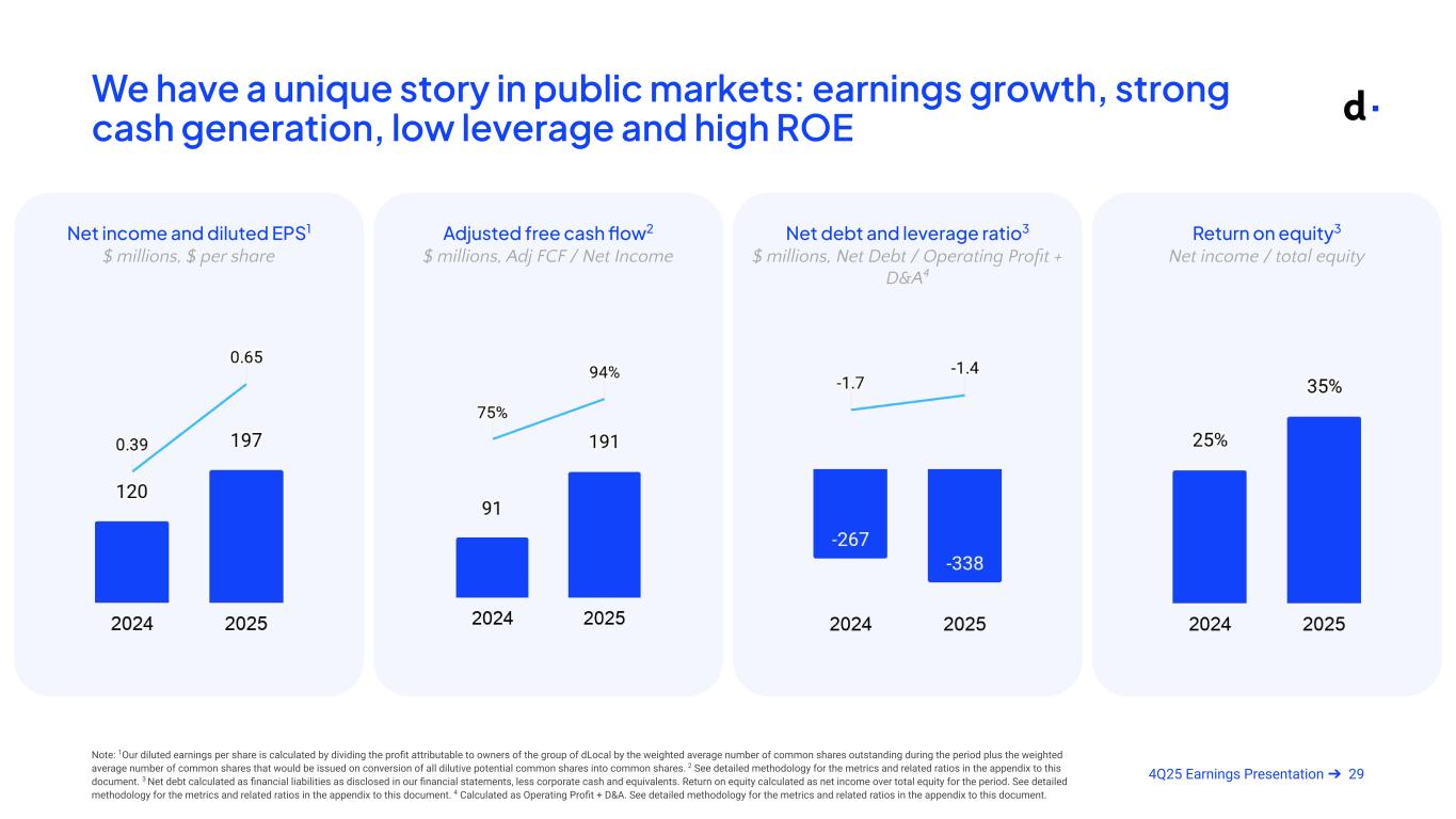 294Q25 Earnings Presentation ➔ We have a unique story in public markets: earnings growth, strong cash generation, low leverage and high ROE Return on equity3 Net income / total equity Net income and diluted EPS1 $ millions, $ per share Net debt and leverage ratio3 $ millions, Net Debt / Operating Profit + D&A4 Adjusted free cash flow2 $ millions, Adj FCF / Net Income Note: 1Our diluted earnings per share is calculated by dividing the profit attributable to owners of the group of dLocal by the weighted average number of common shares outstanding during the period plus the weighted average number of common shares that would be issued on conversion of all dilutive potential common shares into common shares. 2 See detailed methodology for the metrics and related ratios in the appendix to this document. 3 Net debt calculated as financial liabilities as disclosed in our financial statements, less corporate cash and equivalents. Return on equity calculated as net income over total equity for the period. See detailed methodology for the metrics and related ratios in the appendix to this document. 4 Calculated as Operating Profit + D&A. See detailed methodology for the metrics and related ratios in the appendix to this document. Armado Mar 11 @ 9pm