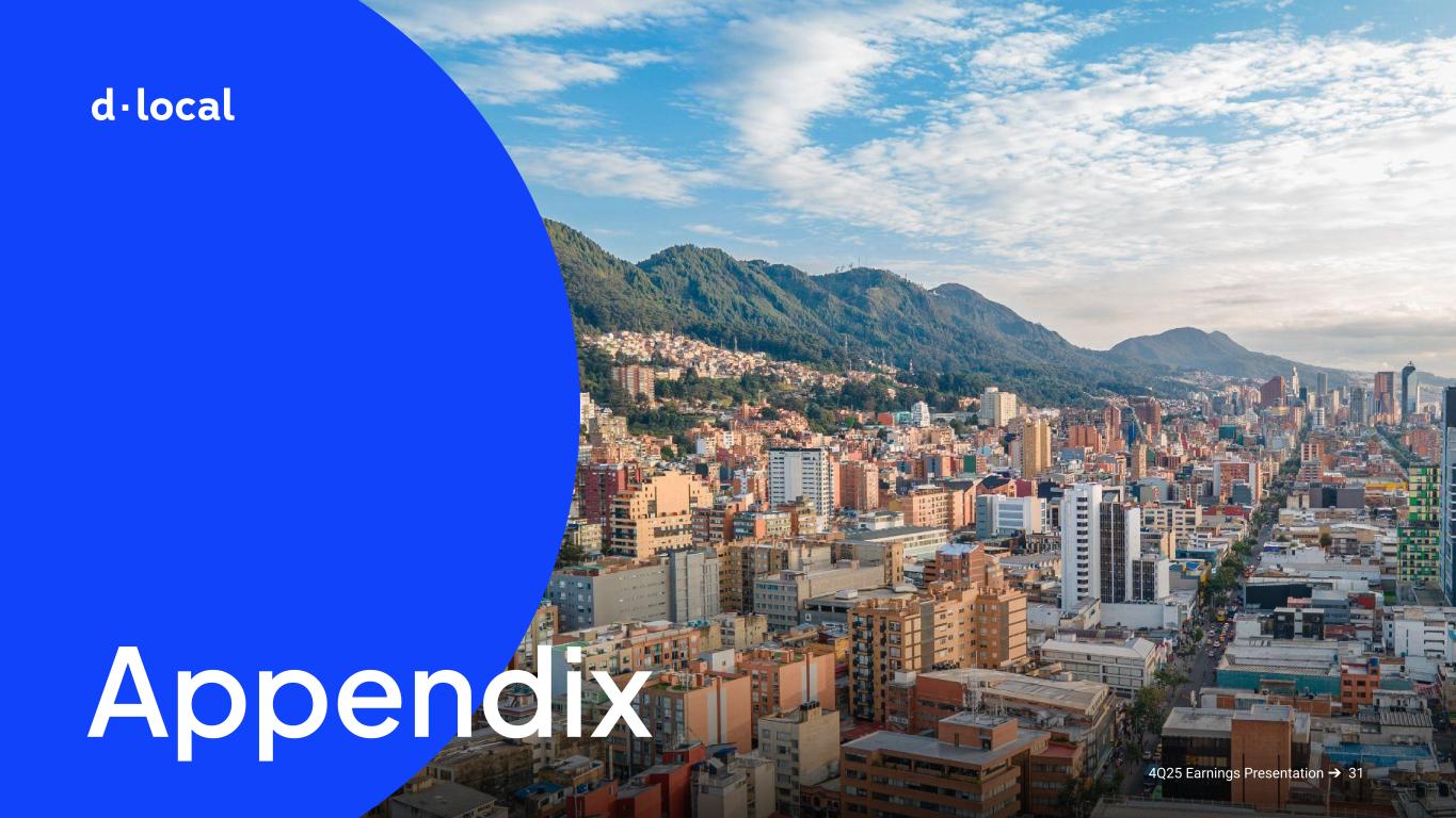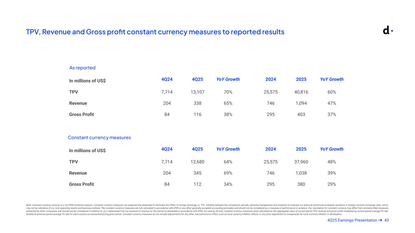 434Q25 Earnings Presentation ➔ TPV, Revenue and Gross profit constant currency measures to reported results As reported Constant currency measures Note: Constant currency revenue is a non-IFRS financial measure. Constant currency measures are prepared and presented to eliminate the effect of foreign exchange, or “FX,” volatility between the comparison periods, allowing management and investors to evaluate our financial performance despite variations in foreign currency exchange rates, which may not be indicative of our core operating results and business outlook. The constant currency measures are not calculated in accordance with IFRS or any other generally accepted accounting principles and should not be considered as a measure of performance in isolation. Our calculation for constant currency may differ from similarly-titled measures presented by other companies and should not be considered in isolation or as a replacement for our measure of revenue for the period as presented in accordance with IFRS. As used by dLocal, constant currency measures were calculated as the aggregated value of current period TPV, revenue and gross profit multiplied by current period average FX rate divided by previous period average FX rate for each country we transacted during given period. Constant currency measures do not include adjustments for any other macroeconomic effect, such as local currency inflation effects, or any price adjustment to compensate for local currency inflation or devaluation. In millions of US$ 4Q24 4Q25 YoY Growth 2024 2025 YoY Growth TPV 7,714 13,107 70% 25,575 40,816 60% Revenue 204 338 65% 746 1,094 47% Gross Profit 84 116 38% 295 403 37% In millions of US$ 4Q24 4Q25 YoY Growth 2024 2025 YoY Growth TPV 7,714 12,680 64% 25,575 37,960 48% Revenue 204 345 69% 746 1,038 39% Gross Profit 84 112 34% 295 380 29%