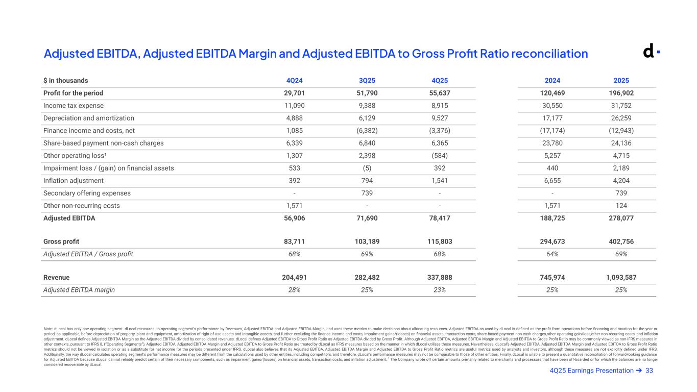 334Q25 Earnings Presentation ➔ Adjusted EBITDA, Adjusted EBITDA Margin and Adjusted EBITDA to Gross Profit Ratio reconciliation Note: dLocal has only one operating segment. dLocal measures its operating segment’s performance by Revenues, Adjusted EBITDA and Adjusted EBITDA Margin, and uses these metrics to make decisions about allocating resources. Adjusted EBITDA as used by dLocal is defined as the profit from operations before financing and taxation for the year or period, as applicable, before depreciation of property, plant and equipment, amortization of right-of-use assets and intangible assets, and further excluding the finance income and costs, impairment gains/(losses) on financial assets, transaction costs, share-based payment non-cash charges,other operating gain/loss,other non-recurring costs, and inflation adjustment. dLocal defines Adjusted EBITDA Margin as the Adjusted EBITDA divided by consolidated revenues. dLocal defines Adjusted EBITDA to Gross Profit Ratio as Adjusted EBITDA divided by Gross Profit. Although Adjusted EBITDA, Adjusted EBITDA Margin and Adjusted EBITDA to Gross Profit Ratio may be commonly viewed as non-IFRS measures in other contexts, pursuant to IFRS 8, (“Operating Segments”), Adjusted EBITDA, Adjusted EBITDA Margin and Adjusted EBITDA to Gross Profit Ratio are treated by dLocal as IFRS measures based on the manner in which dLocal utilizes these measures. Nevertheless, dLocal’s Adjusted EBITDA, Adjusted EBITDA Margin and Adjusted EBITDA to Gross Profit Ratio metrics should not be viewed in isolation or as a substitute for net income for the periods presented under IFRS. dLocal also believes that its Adjusted EBITDA, Adjusted EBITDA Margin and Adjusted EBITDA to Gross Profit Ratio metrics are useful metrics used by analysts and investors, although these measures are not explicitly defined under IFRS. Additionally, the way dLocal calculates operating segment’s performance measures may be different from the calculations used by other entities, including competitors, and therefore, dLocal’s performance measures may not be comparable to those of other entities. Finally, dLocal is unable to present a quantitative reconciliation of forward-looking guidance for Adjusted EBITDA because dLocal cannot reliably predict certain of their necessary components, such as impairment gains/(losses) on financial assets, transaction costs, and inflation adjustment. 1 The Company wrote off certain amounts primarily related to merchants and processors that have been off-boarded or for which the balances are no longer considered recoverable by dLocal. Armado Mar 11 @ 9pm $ in thousands 4Q24 3Q25 4Q25 2024 2025 Profit for the period 29,701 51,790 55,637 120,469 196,902 Income tax expense 11,090 9,388 8,915 30,550 31,752 Depreciation and amortization 4,888 6,129 9,527 17,177 26,259 Finance income and costs, net 1,085 (6,382) (3,376) (17,174) (12,943) Share-based payment non-cash charges 6,339 6,840 6,365 23,780 24,136 Other operating loss¹ 1,307 2,398 (584) 5,257 4,715 Impairment loss / (gain) on financial assets 533 (5) 392 440 2,189 Inflation adjustment 392 794 1,541 6,655 4,204 Secondary offering expenses - 739 - - 739 Other non-recurring costs 1,571 - - 1,571 124 Adjusted EBITDA 56,906 71,690 78,417 188,725 278,077 Gross profit 83,711 103,189 115,803 294,673 402,756 Adjusted EBITDA / Gross profit 68% 69% 68% 64% 69% Revenue 204,491 282,482 337,888 745,974 1,093,587 Adjusted EBITDA margin 28% 25% 23% 25% 25%