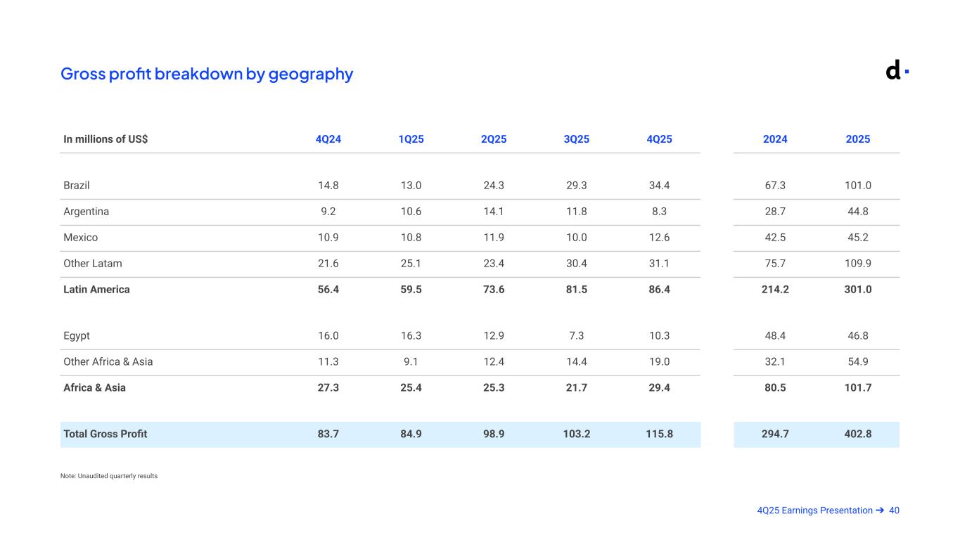 404Q25 Earnings Presentation ➔ Gross profit breakdown by geography Note: Unaudited quarterly results In millions of US$ 4Q24 1Q25 2Q25 3Q25 4Q25 2024 2025 Brazil 14.8 13.0 24.3 29.3 34.4 67.3 101.0 Argentina 9.2 10.6 14.1 11.8 8.3 28.7 44.8 Mexico 10.9 10.8 11.9 10.0 12.6 42.5 45.2 Other Latam 21.6 25.1 23.4 30.4 31.1 75.7 109.9 Latin America 56.4 59.5 73.6 81.5 86.4 214.2 301.0 Egypt 16.0 16.3 12.9 7.3 10.3 48.4 46.8 Other Africa & Asia 11.3 9.1 12.4 14.4 19.0 32.1 54.9 Africa & Asia 27.3 25.4 25.3 21.7 29.4 80.5 101.7 Total Gross Profit 83.7 84.9 98.9 103.2 115.8 294.7 402.8