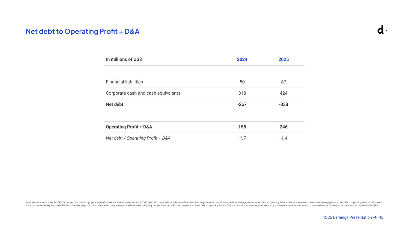 424Q25 Earnings Presentation ➔ Operating Profit + D&A, Operating Profit + D&A margin and Operating Profit + D&A to Gross Profit reconciliation Armado Mar 11 @ 9pm Note: We calculate "Operating Profit + D&A" as operating profit for the period, plus depreciation and amortization. We calculate "Operating Profit + D&A to Gross Profit" for a period by dividing Operating Profit + D&A for the corresponding period by gross profit. Management uses Operating Profit + D&A and Operating Profit + D&A to Gross Profit as supplemental measures that we believe are useful to investors to compare our operating results to the operations of other companies in our industry. Operating Profit + D&A and Operating Profit + D&A to Gross Profit are not financial measures recognized under IFRS and do not purport to be an alternative to operating profit or any other measure of profitability recognized under IFRS. Our presentation of Operating Profit + D&A and Operating Profit + D&A to Gross Profit has limitations as an analytical tool, and you should not consider them in isolation or as a substitute for analysis of our results as reported under IFRS. $ in thousands (except percentages) 4Q24 1Q25 2Q25 3Q25 4Q25 2024 2025 Operating Profit 42,268 45,845 55,765 55,589 62,716 140,500 219,915 Depreciation and amortization 4,888 5,062 5,540 6,129 9,527 17,177 26,259 Operating Profit + D&A 47,156 50,907 61,305 61,718 72,243 157,677 246,175 Gross profit 83,711 84,879 98,885 103,189 115,803 294,673 402,756 Operating Profit + D&A to Gross Profit 56% 60% 62% 60% 62% 54% 61%