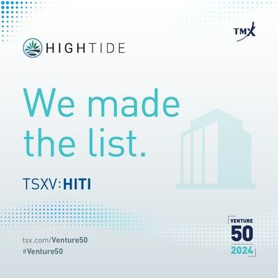 CALGARY, AB, Feb. 22, 2024 /CNW/ - High Tide Inc. ("High Tide" or the "Company") (Nasdaq: HITI) (TSXV: HITI) (FSE: 2LYA), the high-impact, retail-forward enterprise built to deliver real-world value across every component of cannabis, announced today that it has been recognized for the second time in three years by the TSX Venture Exchange (the "TSXV") as a 2024 Top 50 Performer. High Tide ranks fifth in the top 10 diversified industries sector and is the only Canadian cannabis company included in the rankings. The TSX Venture 50 ranks the strongest companies on the TSX Venture Exchange by share price appreciation, trading volume amount, and market capitalization growth. More detailed results and a video highlighting High Tide can be found at www.tsx.com/Venture50