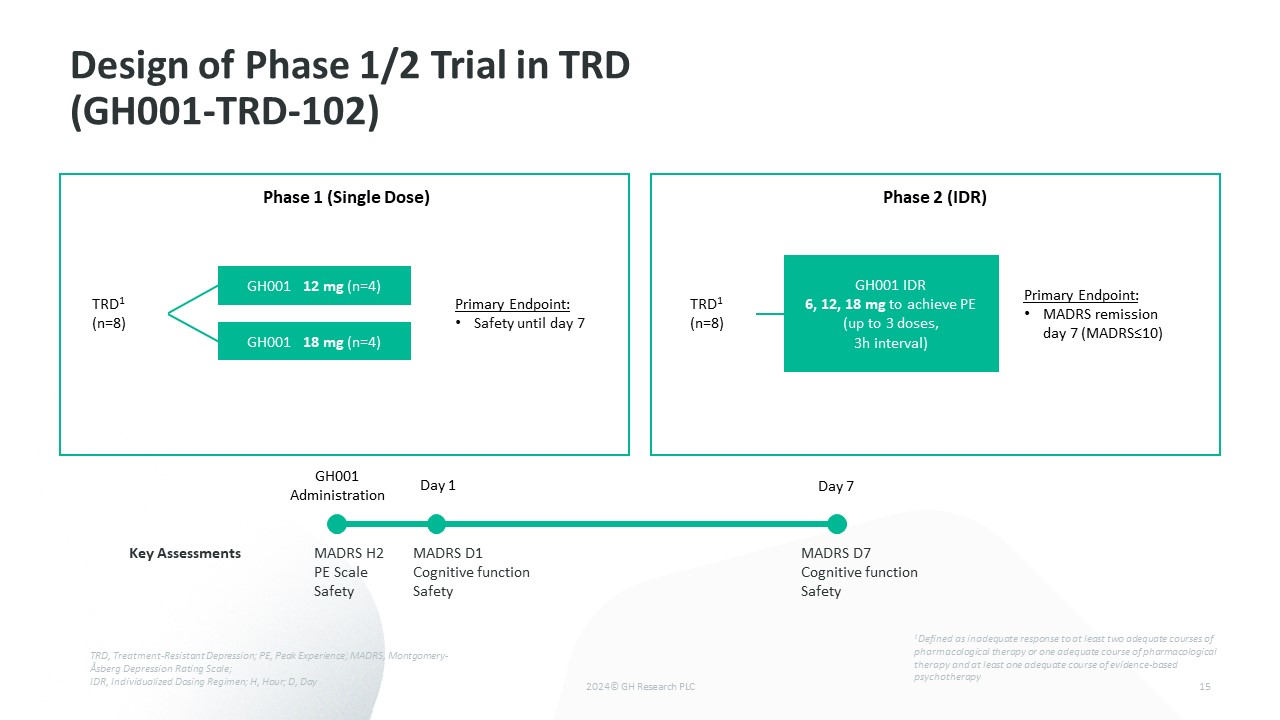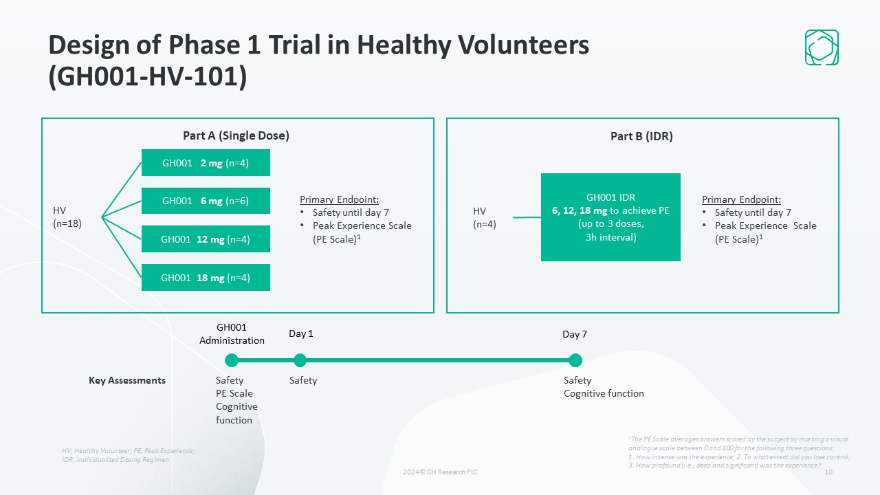 Single Dose and IDR – Safety and Further Results   Safety Review  No SAEs   All ADRs mild  All ADRs resolved spontaneously  Inhalation well-tolerated  No noteworthy changes in vital parameters, except for temporary, non-clinically relevant increase in heart rate and blood pressure shortly after administration of GH001  No clinically relevant changes in ECG, safety laboratory analyses, peak flow, cognitive function, psychiatric safety assessments, including the C-SSRS  Further Results  Pharmacokinetic analyses and psychoactive effect assessments (PE Scale) support that an interval down to 1 hour between individual doses of the IDR is feasible for future clinical trials  23  ADRs  Single-dose   IDR  6 mg (n=8)  12 mg (n=8)  18 mg (n=8)  Placebo (n=6)  1h interval (n=8)1  2h interval (n=8)2  MedDRA Preferred Term  Number of Events  n  n  n  n  n  Abnormal dreams  1  Chest discomfort     1        Crying        2     2     Dizziness     1     Dry mouth  1           Dyskinesia        1           Fatigue  1  2  1  Headache  3  1     1  1  Hypoesthesia oral  1        Paresthesia oral     1  Retching  1        Somnolence  1        Tachycardia  2     Tension     1  Tremor  1        SAE, Serious Adverse Event; Adverse Drug Reaction, or ADR, an adverse event with a relationship code to the investigational product of definite, probable, or possible, or where code is missing; IDR, Individualized Dosing Regimen; C-SSRS, Columbia-Suicide Severity Rating Scale; PE, Peak Experience  16 mg (n=1), 6-12 mg (n=3); 6-12-18 mg (n=4)26-12 mg (n=3); 6-12-18 mg (n=5)