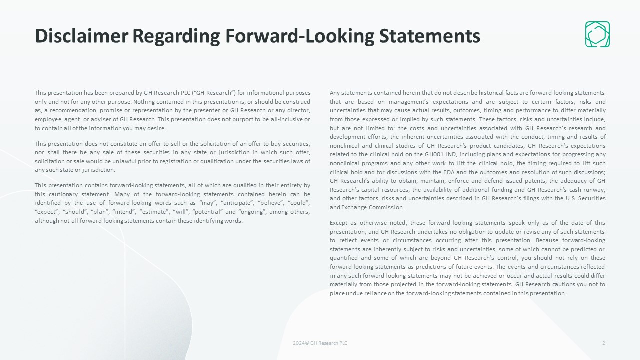 This presentation has been prepared by GH Research PLC (“GH Research”) for informational purposes only and not for any other purpose. Nothing contained in this presentation is, or should be construed as, a recommendation, promise or representation by the presenter or GH Research or any director, employee, agent, or adviser of GH Research. This presentation does not purport to be all-inclusive or to contain all of the information you may desire.  This presentation does not constitute an offer to sell or the solicitation of an offer to buy securities, nor shall there be any sale of these securities in any state or jurisdiction in which such offer, solicitation or sale would be unlawful prior to registration or qualification under the securities laws of any such state or jurisdiction.  This presentation contains forward-looking statements, all of which are qualified in their entirety by this cautionary statement. Many of the forward-looking statements contained herein can be identified by the use of forward-looking words such as “may”, “anticipate”, “believe”, “could”, “expect”, “should”, “plan”, “intend”, “estimate”, “will”, “potential” and “ongoing”, among others, although not all forward-looking statements contain these identifying words.  Any statements contained herein that do not describe historical facts are forward-looking statements that are based on management’s expectations and are subject to certain factors, risks and uncertainties that may cause actual results, outcomes, timing and performance to differ materially from those expressed or implied by such statements. These factors, risks and uncertainties include, but are not limited to: the costs and uncertainties associated with GH Research’s research and development efforts; the inherent uncertainties associated with the conduct, timing and results of nonclinical and clinical studies of GH Research’s product candidates; GH Research’s expectations related to the clinical hold on the GH001 IND, including plans and expectations for progressing any nonclinical programs and any other work to lift the clinical hold, the timing required to lift such clinical hold and for discussions with the FDA and the outcomes and resolution of such discussions; GH Research’s ability to obtain, maintain, enforce and defend issued patents; the adequacy of GH Research’s capital resources, the availability of additional funding and GH Research’s cash runway; and other factors, risks and uncertainties described in GH Research’s filings with the U.S. Securities and Exchange Commission.   Except as otherwise noted, these forward-looking statements speak only as of the date of this presentation, and GH Research undertakes no obligation to update or revise any of such statements to reflect events or circumstances occurring after this presentation. Because forward-looking statements are inherently subject to risks and uncertainties, some of which cannot be predicted or quantified and some of which are beyond GH Research’s control, you should not rely on these forward-looking statements as predictions of future events. The events and circumstances reflected in any such forward-looking statements may not be achieved or occur and actual results could differ materially from those projected in the forward-looking statements. GH Research cautions you not to place undue reliance on the forward-looking statements contained in this presentation.  Disclaimer Regarding Forward-Looking Statements  2