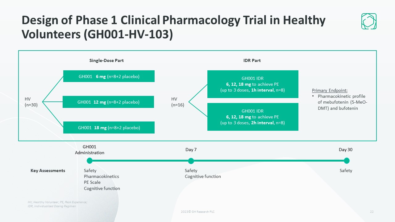 Design of Phase 1 Clinical Pharmacology Trial in Healthy Volunteers (GH001-HV-103)  22  GH001  Administration  Day 7  GH001 6 mg (n=8+2 placebo)  GH001 12 mg (n=8+2 placebo)  GH001 18 mg (n=8+2 placebo)  HV  (n=30)  Single-Dose Part   IDR Part   HV  (n=16)  GH001 IDR6, 12, 18 mg to achieve PE  (up to 3 doses, 1h interval, n=8)  Key Assessments  Safety  Pharmacokinetics  PE Scale  Cognitive function  Safety  Cognitive function  Safety  Day 30  GH001 IDR6, 12, 18 mg to achieve PE  (up to 3 doses, 2h interval, n=8)  Primary Endpoint:  Pharmacokinetic profile of mebufotenin (5-MeO-DMT) and bufotenin  HV, Healthy Volunteer; PE, Peak Experience;IDR, Individualized Dosing Regimen