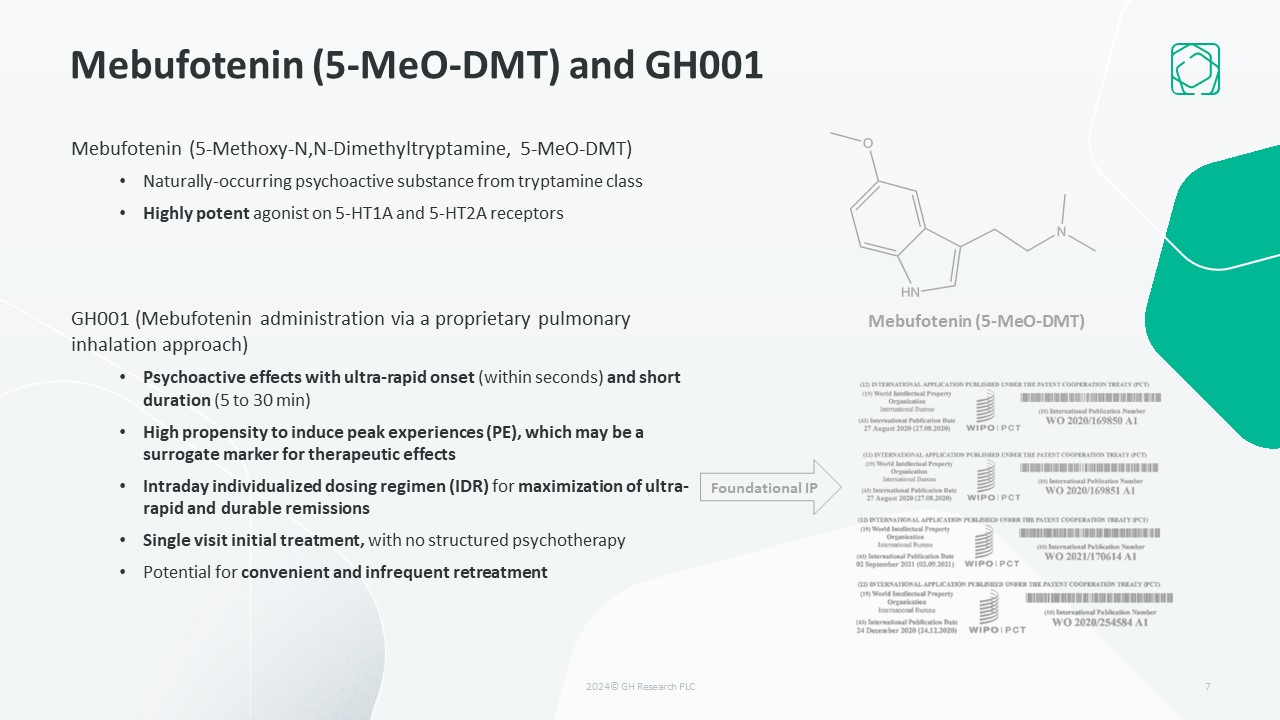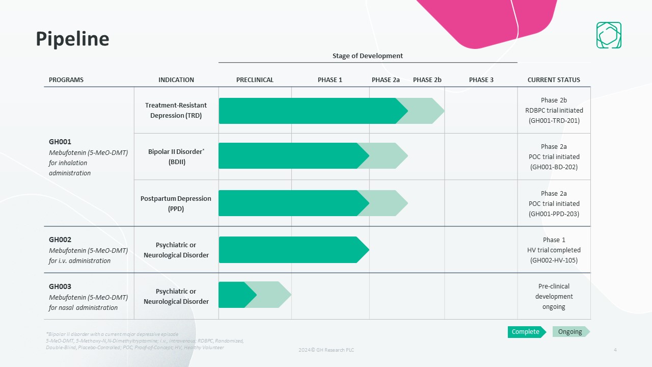 Stage of Development  PROGRAMS  INDICATION  PRECLINICAL  PHASE 1  PHASE 2a PHASE 2b  PHASE 3  CURRENT STATUS  GH001Mebufotenin (5-MeO-DMT)for inhalation administration   Treatment-Resistant Depression (TRD)  Phase 2b RDBPC trial initiated(GH001-TRD-201)  Bipolar II Disorder* (BDII)  Phase 2a POC trial initiated(GH001-BD-202)  Postpartum Depression (PPD)  Phase 2a POC trial initiated(GH001-PPD-203)  GH002Mebufotenin (5-MeO-DMT) for i.v. administration   Psychiatric or Neurological Disorder  Phase 1 HV trial completed(GH002-HV-105)  GH003Mebufotenin (5-MeO-DMT) for nasal administration  Psychiatric or Neurological Disorder  Pre-clinical development ongoing  4  Complete  Ongoing  *Bipolar II disorder with a current major depressive episode  5-MeO-DMT, 5-Methoxy-N,N-Dimethyltryptamine; i.v., intravenous; RDBPC, Randomized, Double-Blind, Placebo-Controlled; POC, Proof-of-Concept; HV, Healthy Volunteer   Pipeline