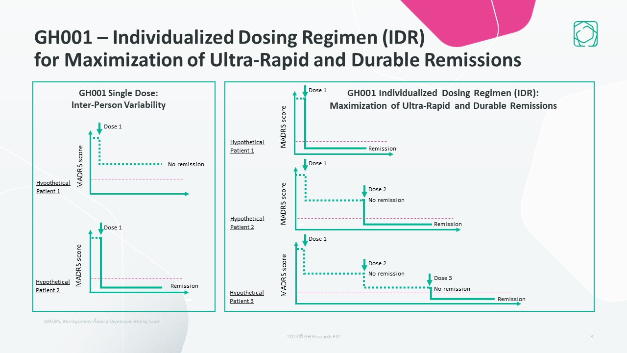 GH001 – Individualized Dosing Regimen (IDR) for Maximization of Ultra-Rapid and Durable Remissions  8  GH001 Single Dose:  Inter-Person Variability  GH001 Individualized Dosing Regimen (IDR):Maximization of Ultra-Rapid and Durable Remissions   MADRS score  MADRS score  MADRS score  MADRS score  Dose 1  Dose 1  Dose 2  Dose 3  Dose 2  Dose 1  No remission  Remission  Remission  Remission  Remission  Hypothetical   Patient 1  Hypothetical   Patient 2  Hypothetical   Patient 3  Hypothetical   Patient 1  Hypothetical   Patient 2  No remission  No remission  No remission  Dose 1  MADRS score  Dose 1  MADRS, Montgomery-Åsberg Depression Rating Scale