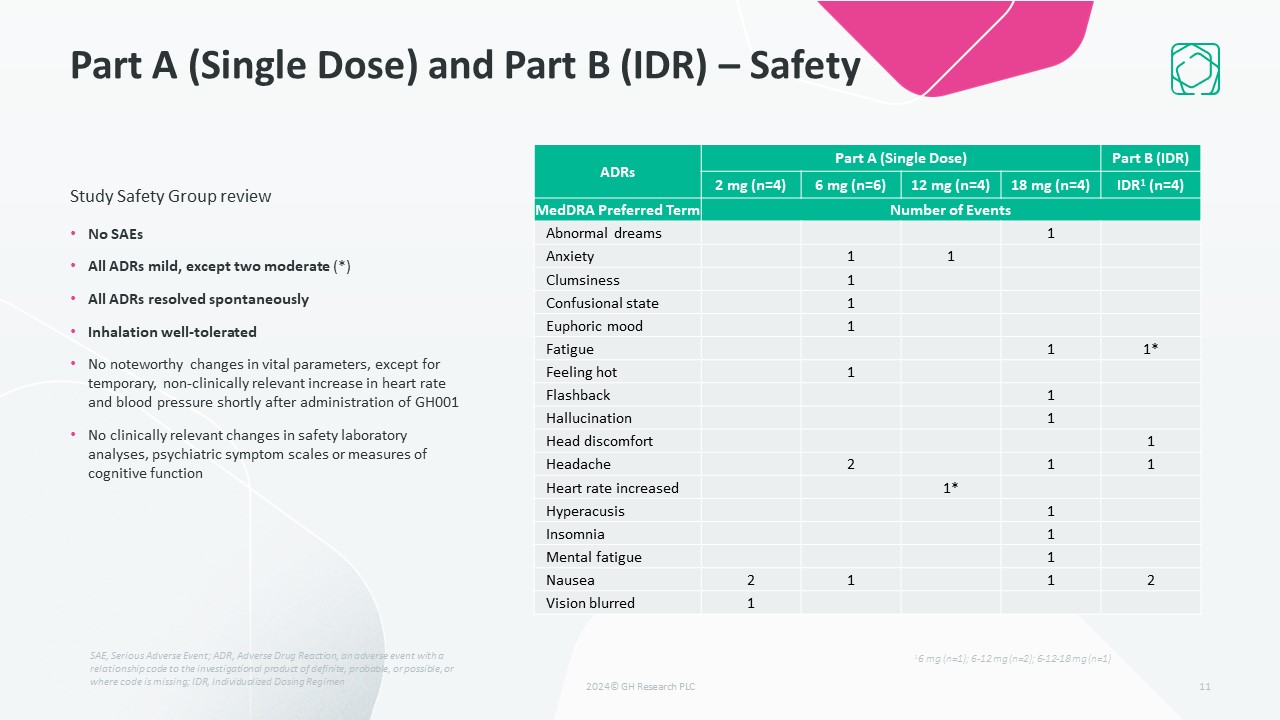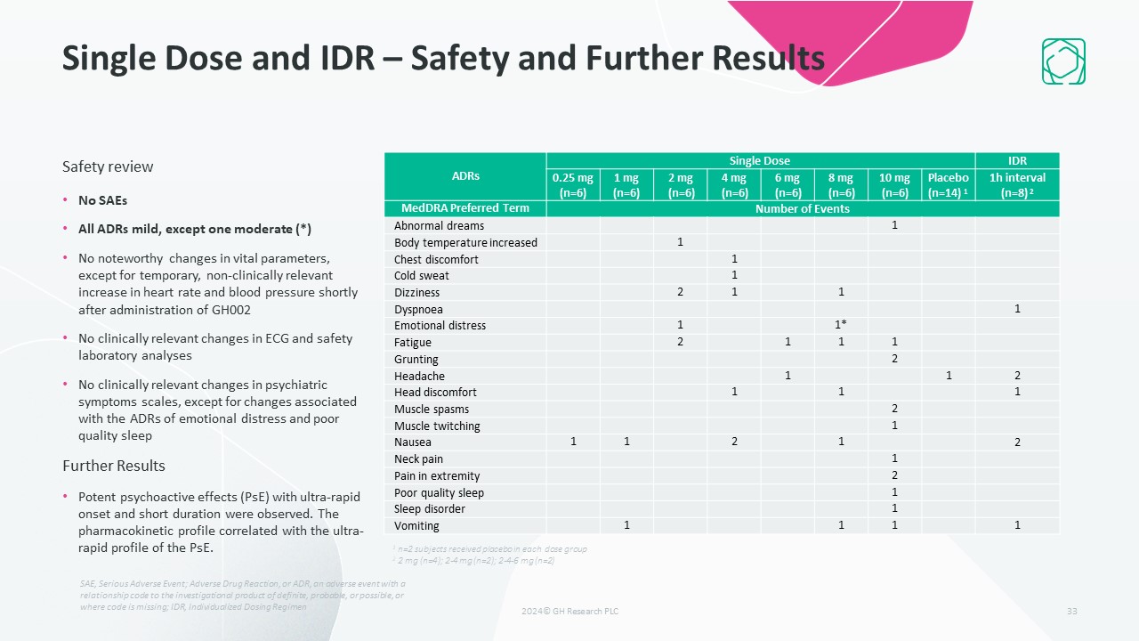 Single Dose and IDR – Safety and Further Results   Safety Review  No SAEs   All ADRs mild  All ADRs resolved spontaneously  Inhalation well-tolerated  No noteworthy changes in vital parameters, except for temporary, non-clinically relevant increase in heart rate and blood pressure shortly after administration of GH001  No clinically relevant changes in ECG, safety laboratory analyses, peak flow, cognitive function or psychiatric symptom scales, including the C-SSRS  Further Results  Pharmacokinetic analyses and psychoactive effect assessments (PE Scale) support that an interval down to 1 hour between individual doses of the IDR is feasible for future clinical trials  30  ADRs  Single-dose   IDR  6 mg (n=8)  12 mg (n=8)  18 mg (n=8)  Placebo (n=6)  1h interval (n=8)1  2h interval (n=8)2  MedDRA Preferred Term  Number of Events  n  n  n  n  n  Abnormal dreams  1  Chest discomfort     1        Crying        2     2     Dizziness     1     Dry mouth  1           Dyskinesia        1           Fatigue  1  2  1  Headache  3  1     1  1  Hypoesthesia oral  1        Paresthesia oral     1  Retching  1        Somnolence  1        Tachycardia  2     Tension     1  Tremor  1        SAE, Serious Adverse Event; Adverse Drug Reaction, or ADR, an adverse event with a relationship code to the investigational product of definite, probable, or possible, or where code is missing; IDR, Individualized Dosing Regimen; C-SSRS, Columbia-Suicide Severity Rating Scale; PE, Peak Experience  16 mg (n=1), 6-12 mg (n=3); 6-12-18 mg (n=4)26-12 mg (n=3); 6-12-18 mg (n=5)