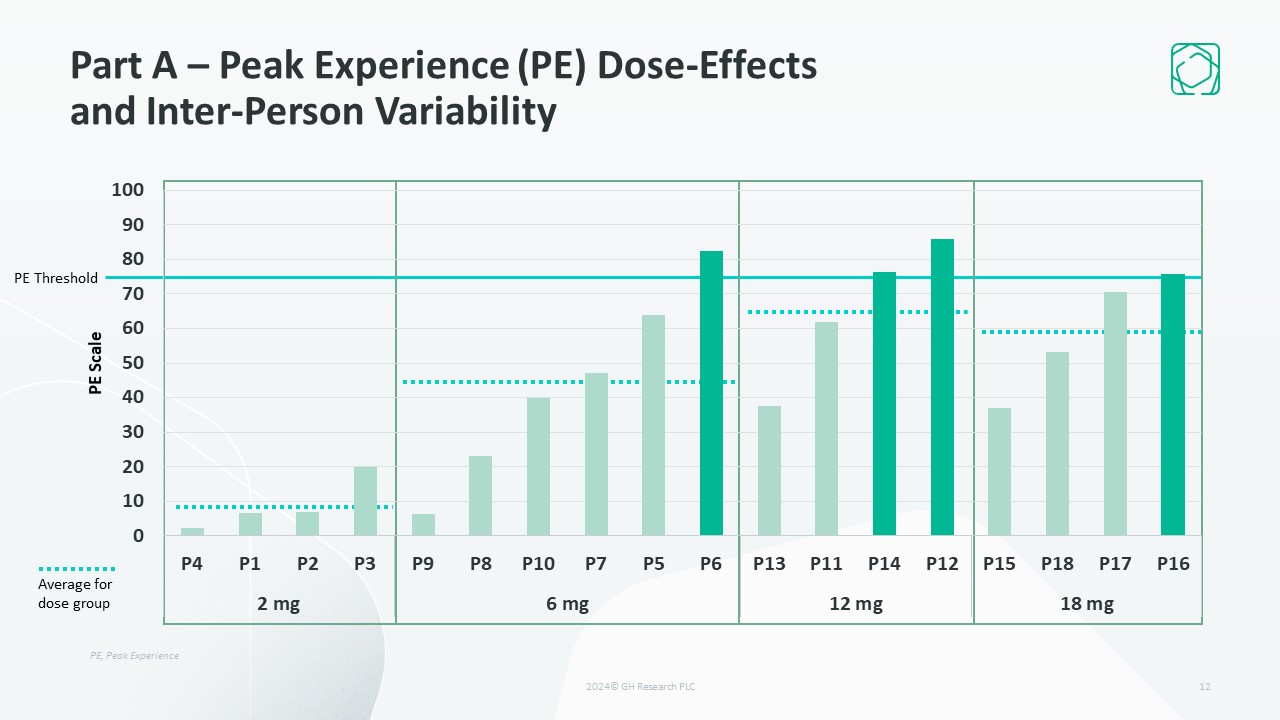 Part A – Peak Experience (PE) Dose-Effectsand Inter-Person Variability  12  Average fordose group  PE Scale  PE Threshold  PE, Peak Experience