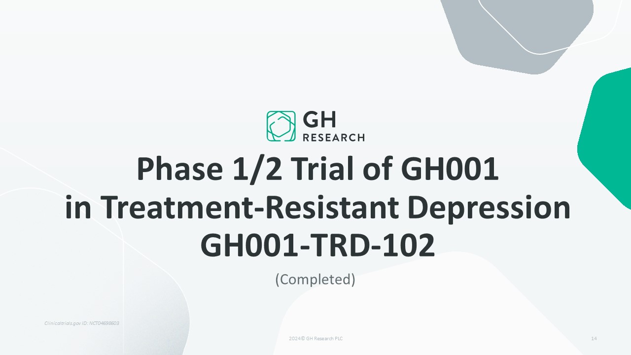 (Completed)  Phase 1/2 Trial of GH001 in Treatment-Resistant DepressionGH001-TRD-102  14  Clinicaltrials.gov ID: NCT04698603