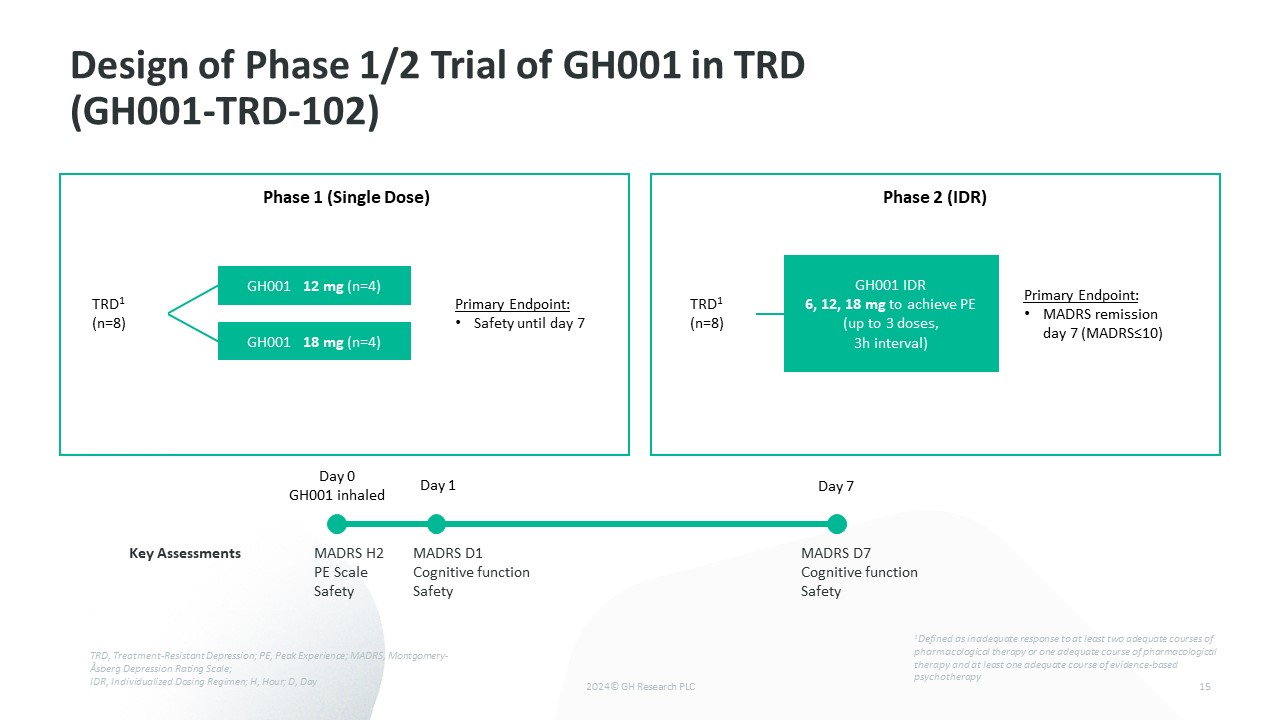 Design of Phase 2b Trial in TRD (GH001-TRD-201)  22  GH001 IDR   Placebo IDR     n=80  Randomization 1:1  Up to 5 GH001 IDRs   may be administered during the OLE pro re nata (PRN),   based on specific re-treatment criteria  D0  MADRS  Primary Endpoint   ΔMADRS  (per FDA guidance for rapid-acting antidepressants*)  D1  D7  B H2  Scheduled Visit  Double-Blind Phase  Open-label Extension Phase (OLE)  D14  M2  M3  M4  M5  M6  M1  During the OLE, additional clinic visits can be scheduled if required for medical reasons  D0  D1  D7  B H2  PRN  The bold solid lines indicate the fixed duration of 7 days (± 1 day) after an IDR with visits on D0, D1 and D7. The bold dotted line indicates the variable duration until a potential GH001 IDR in the OLE. The GH001 IDR consists of up to 3 increasing doses (6, 12, 18 mg) and the Placebo IDR consists of up to three placebo doses, to achieve a peak experience, given at a 1H interval. As in previously completed trials, the GH001-TRD-201 trial will be conducted under the supervision of a healthcare provider, but without any planned psychotherapeutic interventions before, during, or after dosing. IDR, Individualized Dosing Regimen; PRN, pro re nata (as needed); B, Baseline; H, Hour; D, Day; M, Month. *FDA draft guidance for industry “Major Depressive Disorder: Developing Drugs for Treatment”