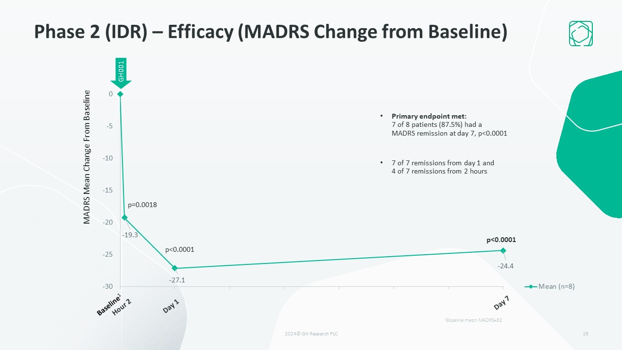 Phase 2 (IDR) – Efficacy (MADRS)  18  Primary endpoint met: 7 of 8 patients (87.5%) had a MADRS remission at day 7, p<0.0001  7 of 8 patients had a PE and 6 of those had a MADRS remission at day 7  MADRS Remission / Response / Improvement Rate Day 7  PE, Peak Experience; MADRS, Montgomery–Åsberg Depression Rating ScaleMADRS remission = MADRS of ≤10; MADRS response = Reduction of ≥50% from baseline in MADRS; MADRS any improvement = any reduction from baseline in MADRS