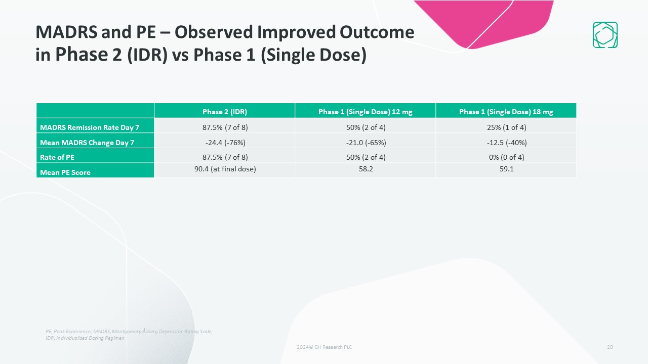 MADRS and PE – Observed Improved Outcome in Phase 2 (IDR) vs Phase 1 (Single Dose)  20  Phase 2 (IDR)  Phase 1 (Single Dose) 12 mg  Phase 1 (Single Dose) 18 mg  MADRS Remission Rate Day 7  87.5% (7 of 8)  50% (2 of 4)  25% (1 of 4)  Mean MADRS Change Day 7  -24.4 (-76%)  -21.0 (-65%)  -12.5 (-40%)  Rate of PE  87.5% (7 of 8)  50% (2 of 4)  0% (0 of 4)  Mean PE Score  90.4 (at final dose)  58.2  59.1  PE, Peak Experience; MADRS, Montgomery-Åsberg Depression Rating Scale; IDR, Individualized Dosing Regimen