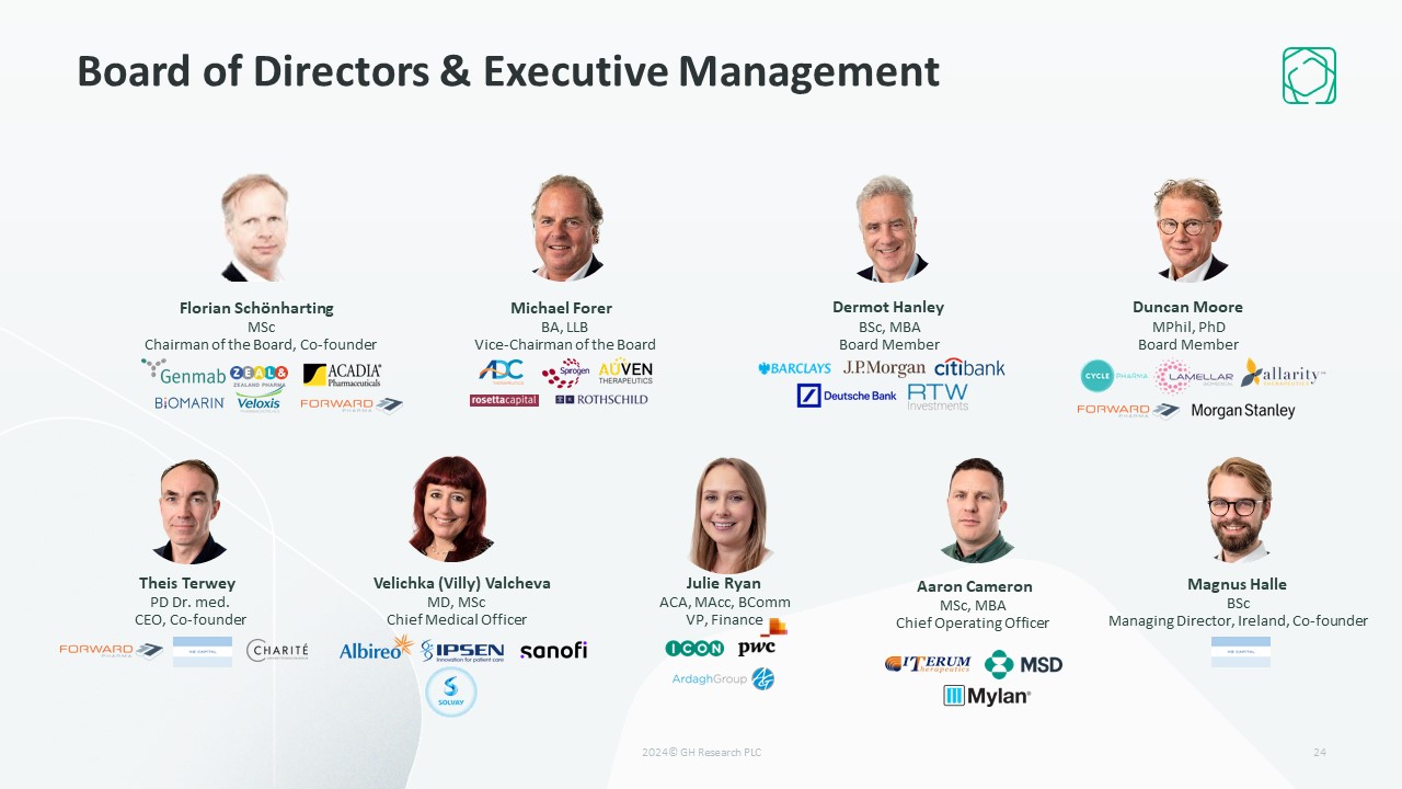 This presentation has been prepared by GH Research PLC (“GH Research”) for informational purposes only and not for any other purpose. Nothing contained in this presentation is, or should be construed as, a recommendation, promise or representation by the presenter or GH Research or any director, employee, agent, or adviser of GH Research. This presentation does not purport to be all-inclusive or to contain all of the information you may desire.  This presentation does not constitute an offer to sell or the solicitation of an offer to buy securities, nor shall there be any sale of these securities in any state or jurisdiction in which such offer, solicitation or sale would be unlawful prior to registration or qualification under the securities laws of any such state or jurisdiction.  This presentation contains forward-looking statements, all of which are qualified in their entirety by this cautionary statement. Many of the forward-looking statements contained herein can be identified by the use of forward-looking words such as “may”, “anticipate”, “believe”, “could”, “expect”, “should”, “plan”, “intend”, “estimate”, “will”, “potential” and “ongoing”, among others, although not all forward-looking statements contain these identifying words.  Any statements contained herein that do not describe historical facts are forward-looking statements that are based on management’s expectations and are subject to certain factors, risks and uncertainties that may cause actual results, outcomes, timing and performance to differ materially from those expressed or implied by such statements. These factors, risks and uncertainties include, but are not limited to: the costs and uncertainties associated with GH Research’s research and development efforts; the inherent uncertainties associated with the conduct, timing and results of nonclinical and clinical studies of GH Research’s product candidates; GH Research’s expectations related to the clinical hold on the GH001 IND, including plans and expectations for progressing any nonclinical programs and any other work to lift the clinical hold, the timing required to lift such clinical hold and for discussions with the FDA and the outcomes and resolution of such discussions; GH Research’s ability to obtain, maintain, enforce and defend issued patents; the adequacy of GH Research’s capital resources, the availability of additional funding and GH Research’s cash runway; and other factors, risks and uncertainties described in GH Research’s filings with the U.S. Securities and Exchange Commission.   Except as otherwise noted, these forward-looking statements speak only as of the date of this presentation, and GH Research undertakes no obligation to update or revise any of such statements to reflect events or circumstances occurring after this presentation. Because forward-looking statements are inherently subject to risks and uncertainties, some of which cannot be predicted or quantified and some of which are beyond GH Research’s control, you should not rely on these forward-looking statements as predictions of future events. The events and circumstances reflected in any such forward-looking statements may not be achieved or occur and actual results could differ materially from those projected in the forward-looking statements. GH Research cautions you not to place undue reliance on the forward-looking statements contained in this presentation.  Disclaimer Regarding Forward-Looking Statements  2