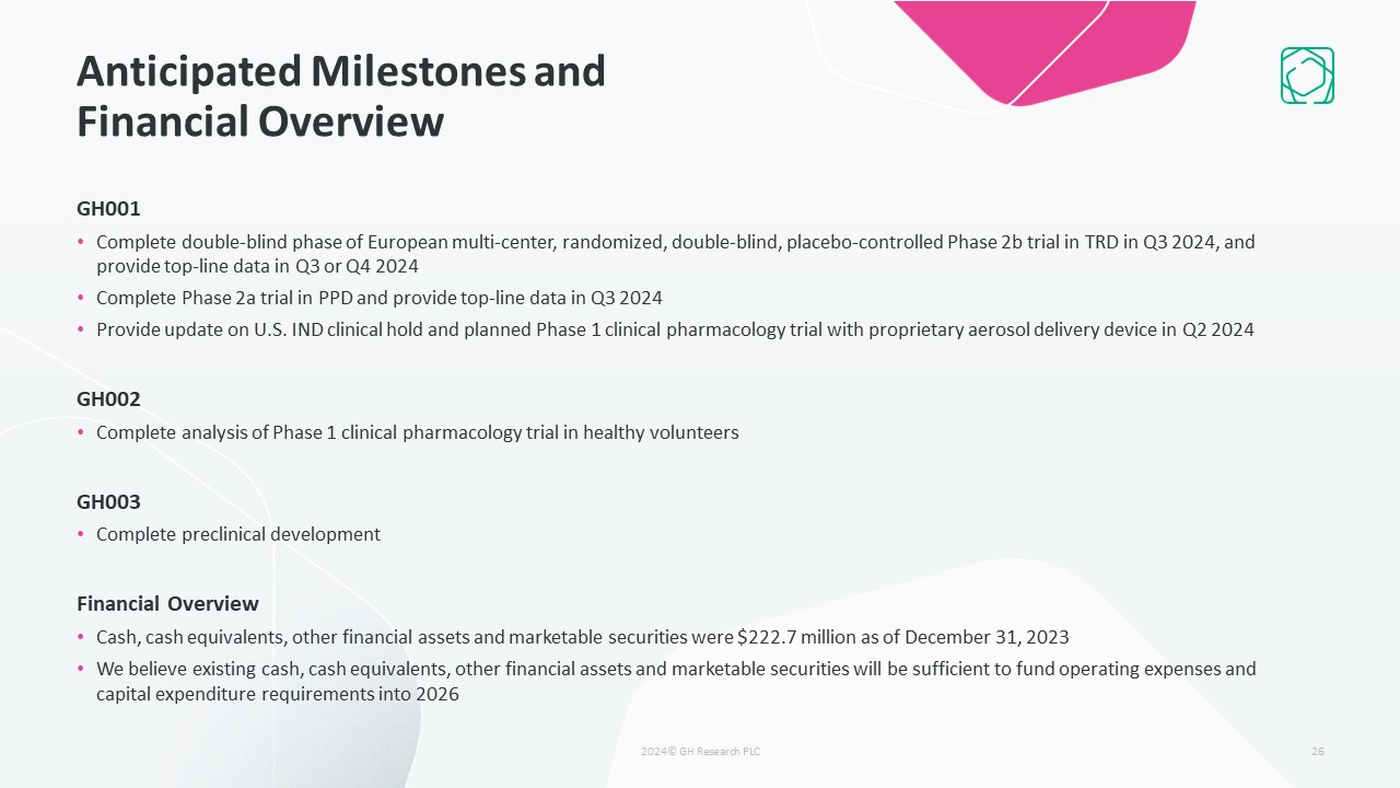 Anticipated Milestones and Financial Overview  GH001  Complete double-blind phase of European multi-center, randomized, double-blind, placebo-controlled Phase 2b trial in TRD in Q3 2024, and provide top-line data in Q3 or Q4 2024  Complete Phase 2a trial in PPD and provide top-line data in Q3 2024  Provide update on U.S. IND clinical hold and planned Phase 1 clinical pharmacology trial with proprietary aerosol delivery device in Q2 2024  GH002   Complete analysis of Phase 1 clinical pharmacology trial in healthy volunteers  GH003  Complete preclinical development  Financial Overview   Cash, cash equivalents, other financial assets and marketable securities were $222.7 million as of December 31, 2023  We believe existing cash, cash equivalents, other financial assets and marketable securities will be sufficient to fund operating expenses and capital expenditure requirements into 2026  26