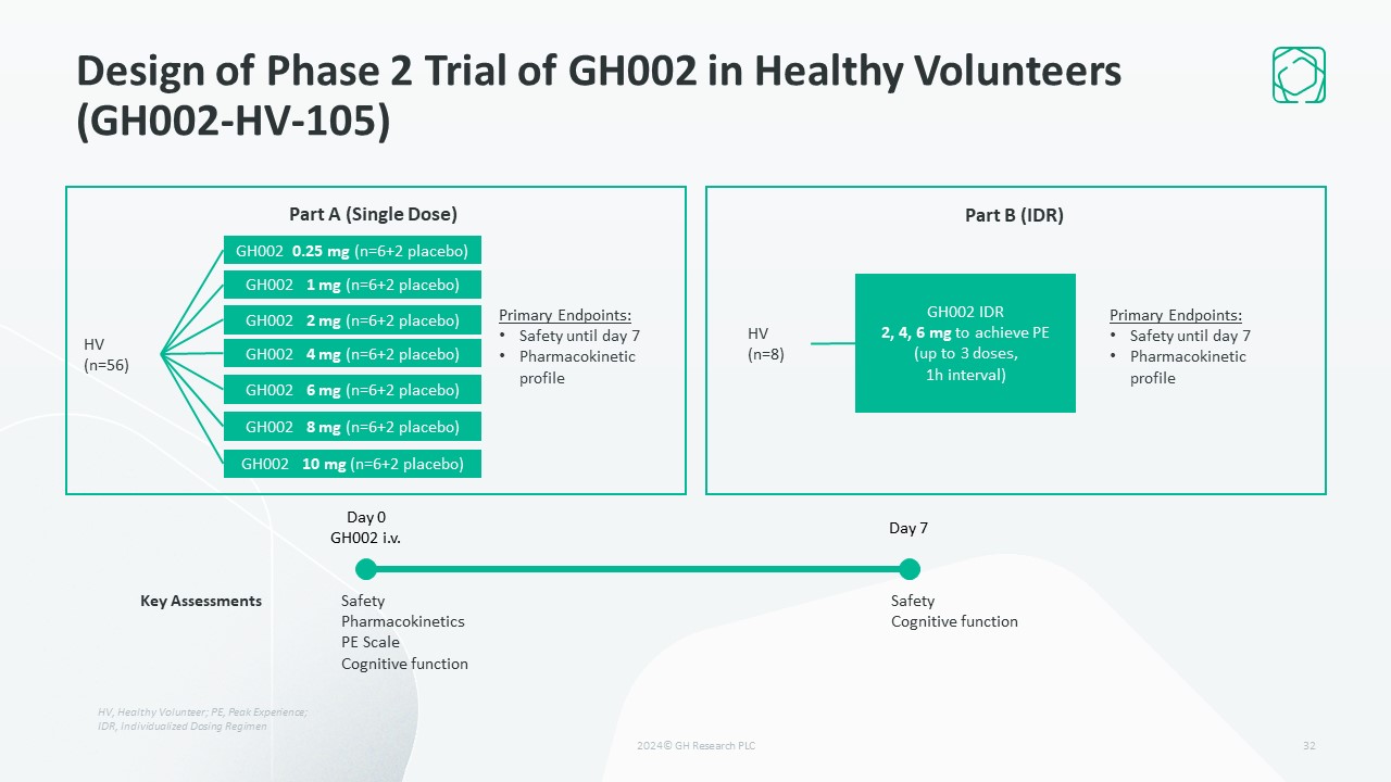 Design of Phase 1 Clinical Pharmacology Trial of GH001 in Healthy Volunteers (GH001-HV-103)  29  Day 0  GH001 inhaled  Day 7  GH001 6 mg (n=8+2 placebo)  GH001 12 mg (n=8+2 placebo)  GH001 18 mg (n=8+2 placebo)  HV  (n=30)  Single-Dose Part   IDR Part   HV  (n=16)  GH001 IDR6, 12, 18 mg to achieve PE  (up to 3 doses, 1h interval, n=8)  Key Assessments  Safety  Pharmacokinetics  PE Scale  Cognitive function  Safety  Cognitive function  Safety  Day 30  GH001 IDR6, 12, 18 mg to achieve PE  (up to 3 doses, 2h interval, n=8)  Primary Endpoint:  Pharmacokinetic profile of mebufotenin (5-MeO-DMT) and bufotenin  HV, Healthy Volunteer; PE, Peak Experience;IDR, Individualized Dosing Regimen