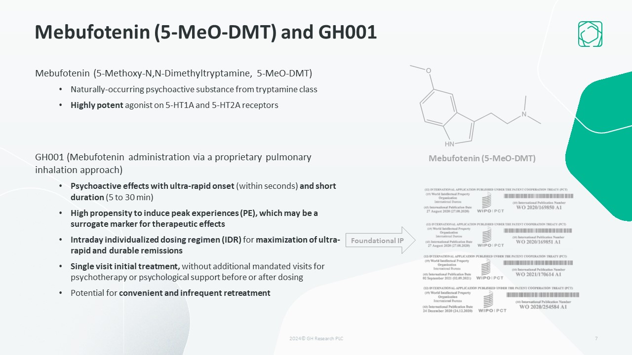 Stage of Development  PROGRAMS  INDICATION  PRECLINICAL  PHASE 1  PHASE 2a PHASE 2b  PHASE 3  CURRENT STATUS  GH001Mebufotenin (5-MeO-DMT)for inhalation administration   Treatment-Resistant Depression (TRD)  Phase 2b RDBPC trial initiated(GH001-TRD-201)  Bipolar II Disorder* (BDII)  Phase 2a POC trial initiated(GH001-BD-202)  Postpartum Depression (PPD)  Phase 2a POC trial initiated(GH001-PPD-203)  GH002Mebufotenin (5-MeO-DMT) for i.v. administration   Psychiatric or Neurological Disorder  Phase 1 HV trial completed(GH002-HV-105)  GH003Mebufotenin (5-MeO-DMT) for nasal administration  Psychiatric or Neurological Disorder  Pre-clinical development ongoing  4  Complete  Ongoing  *Bipolar II disorder with a current major depressive episode  5-MeO-DMT, 5-Methoxy-N,N-Dimethyltryptamine; i.v., intravenous; RDBPC, Randomized, Double-Blind, Placebo-Controlled; POC, Proof-of-Concept; HV, Healthy Volunteer   Pipeline