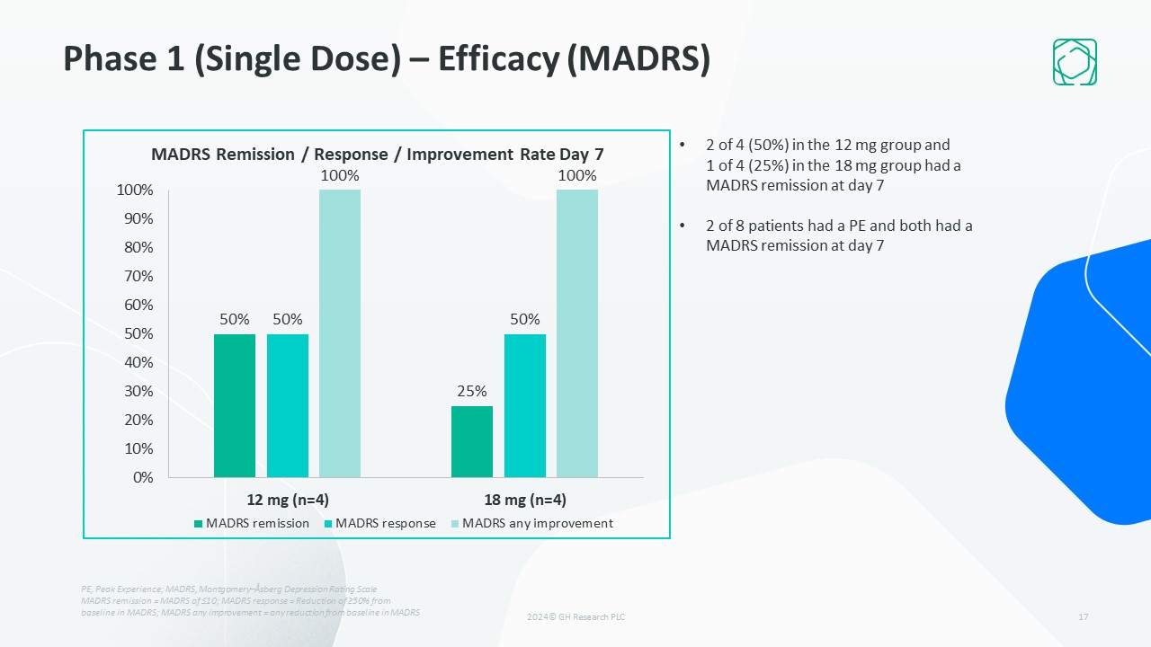 Phase 1 (Single Dose) and Phase 2 (IDR) – Safety  16  ADRs  Phase 1 (Single Dose)  Phase 2 (IDR)  ADRs  12 mg (n=4)  18 mg (n=4)  IDR1 (n=8)  MedDRA Preferred Term  Number of Events  n  n  Abdominal discomfort        1  Anxiety        2  Depressive symptom        1*  Dizziness  1     Feeling abnormal  1  1     Flashback  1  1  2  Headache  2  1  3  Muscle discomfort  1  Muscle spasms     1     Nausea        2*  Paresthesia        1  Sensory disturbance  3  SAE, Serious Adverse Event; ADR, Adverse Drug Reaction, an adverse event with a relationship code to the investigational product of definite, probable, or possible, or where code is missing; IDR, Individualized Dosing Regimen; C-SSRS, Columbia-Suicide Severity Rating Scale; MADRS, Montgomery-Åsberg Depression Rating Scale  16-12 mg (n=6); 6-12-18 mg (n=2)  Study Safety Group review  No SAEs  All ADRs mild, except three moderate (*)  All ADRs resolved spontaneously  Inhalation well-tolerated  No noteworthy changes in vital parameters, except for temporary, non-clinically relevant increase in heart rate and blood pressure shortly after administration of GH001  No clinically relevant changes in safety laboratory analyses, psychiatric safety assessments or measures of cognitive function  No safety signal relating to suicidal ideation or suicidal behavior, based on C-SSRS and MADRS subscore item “suicidal thoughts”