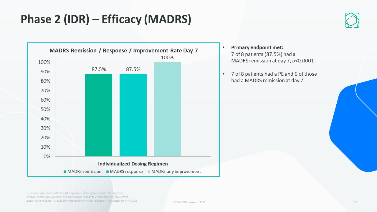 MADRS and PE – Observed Improved Outcome in Phase 2 (IDR) vs Phase 1 (Single Dose)  20  Phase 2 (IDR)  Phase 1 (Single Dose) 12 mg  Phase 1 (Single Dose) 18 mg  MADRS Remission Rate Day 7  87.5% (7 of 8)  50% (2 of 4)  25% (1 of 4)  Mean MADRS Change Day 7  -24.4 (-76%)  -21.0 (-65%)  -12.5 (-40%)  Rate of PE  87.5% (7 of 8)  50% (2 of 4)  0% (0 of 4)  Mean PE Score  90.4 (at final dose)  58.2  59.1  PE, Peak Experience; MADRS, Montgomery-Åsberg Depression Rating Scale; IDR, Individualized Dosing Regimen