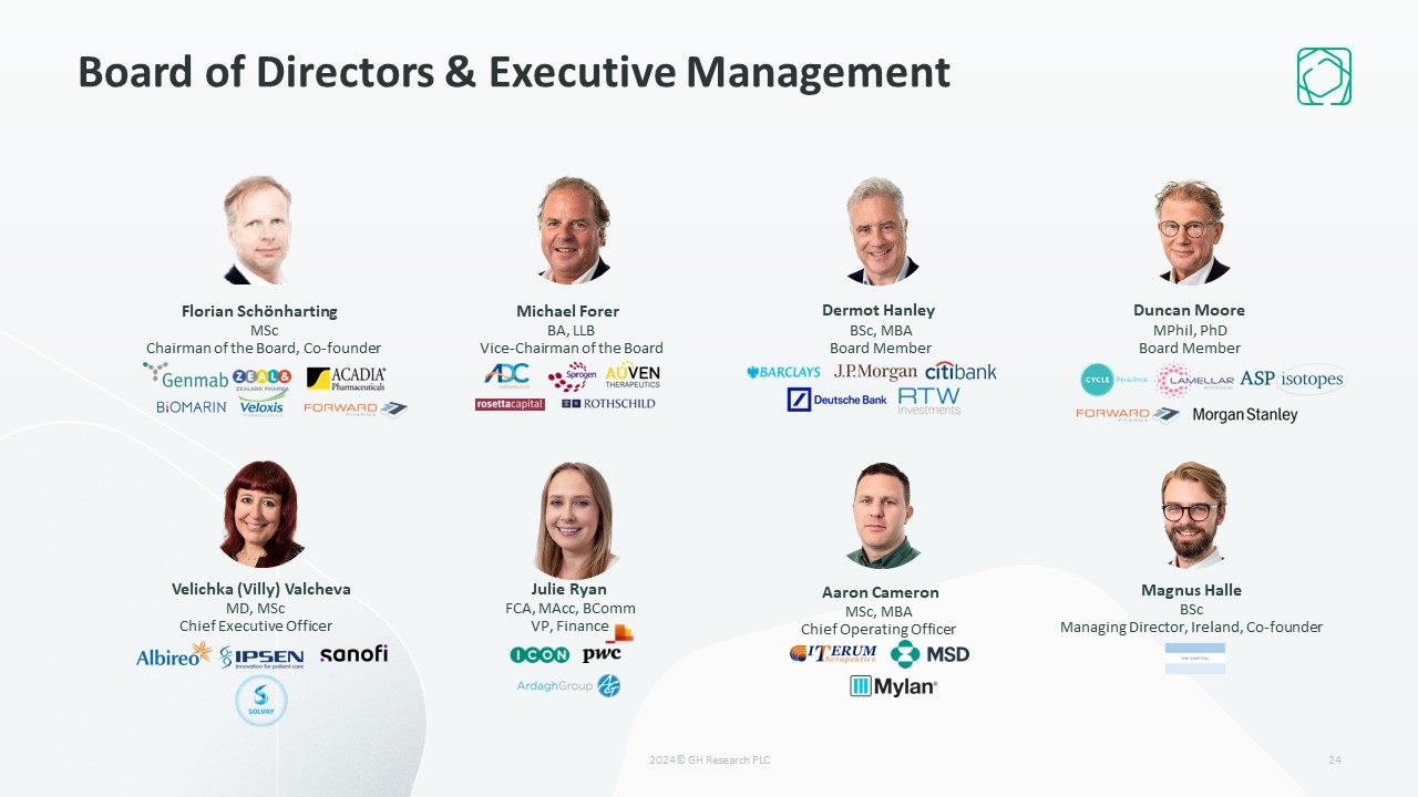 Board of Directors & Executive Management  24  Florian Schönharting  Michael Forer  MSc Chairman of the Board, Co-founder  BA, LLB Vice-Chairman of the Board  Dermot Hanley  Duncan Moore  BSc, MBA Board Member  MPhil, PhD Board Member  Julie Ryan  FCA, MAcc, BComm VP, Finance  Magnus Halle  BSc Managing Director, Ireland, Co-founder  Aaron Cameron   MSc, MBA Chief Operating Officer  Velichka (Villy) Valcheva  MD, MSc Chief Executive Officer