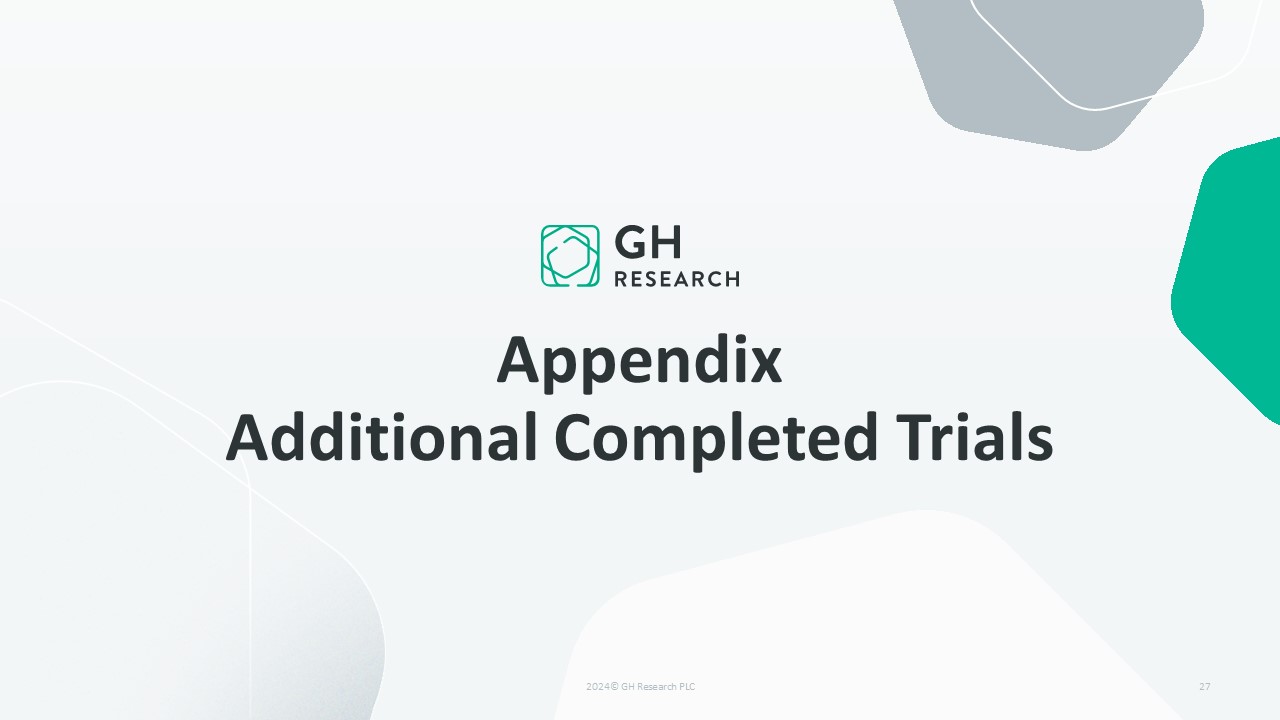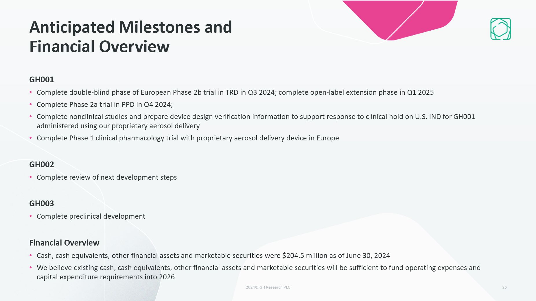 Anticipated Milestones and Financial Overview  GH001  Complete double-blind phase of European Phase 2b trial in TRD in Q3 2024; complete open-label extension phase in Q1 2025  Complete Phase 2a trial in PPD in Q4 2024;   Complete nonclinical studies and prepare device design verification information to support response to clinical hold on U.S. IND for GH001 administered using our proprietary aerosol delivery  Complete Phase 1 clinical pharmacology trial with proprietary aerosol delivery device in Europe   GH002   Complete review of next development steps  GH003  Complete preclinical development  Financial Overview   Cash, cash equivalents, other financial assets and marketable securities were $204.5 million as of June 30, 2024  We believe existing cash, cash equivalents, other financial assets and marketable securities will be sufficient to fund operating expenses and capital expenditure requirements into 2026  26