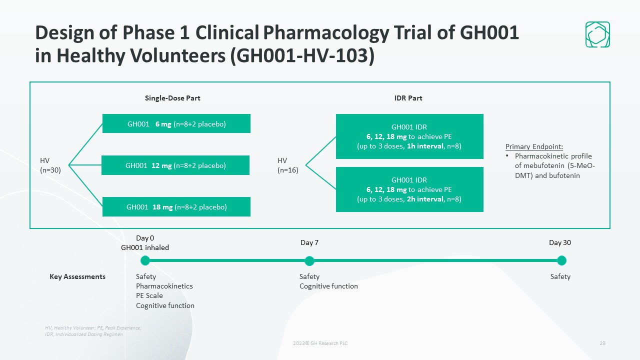 Design of Phase 1 Clinical Pharmacology Trial of GH001 in Healthy Volunteers (GH001-HV-103)  29  Day 0  GH001 inhaled  Day 7  GH001 6 mg (n=8+2 placebo)  GH001 12 mg (n=8+2 placebo)  GH001 18 mg (n=8+2 placebo)  HV  (n=30)  Single-Dose Part   IDR Part   HV  (n=16)  GH001 IDR6, 12, 18 mg to achieve PE  (up to 3 doses, 1h interval, n=8)  Key Assessments  Safety  Pharmacokinetics  PE Scale  Cognitive function  Safety  Cognitive function  Safety  Day 30  GH001 IDR6, 12, 18 mg to achieve PE  (up to 3 doses, 2h interval, n=8)  Primary Endpoint:  Pharmacokinetic profile of mebufotenin (5-MeO-DMT) and bufotenin  HV, Healthy Volunteer; PE, Peak Experience;IDR, Individualized Dosing Regimen