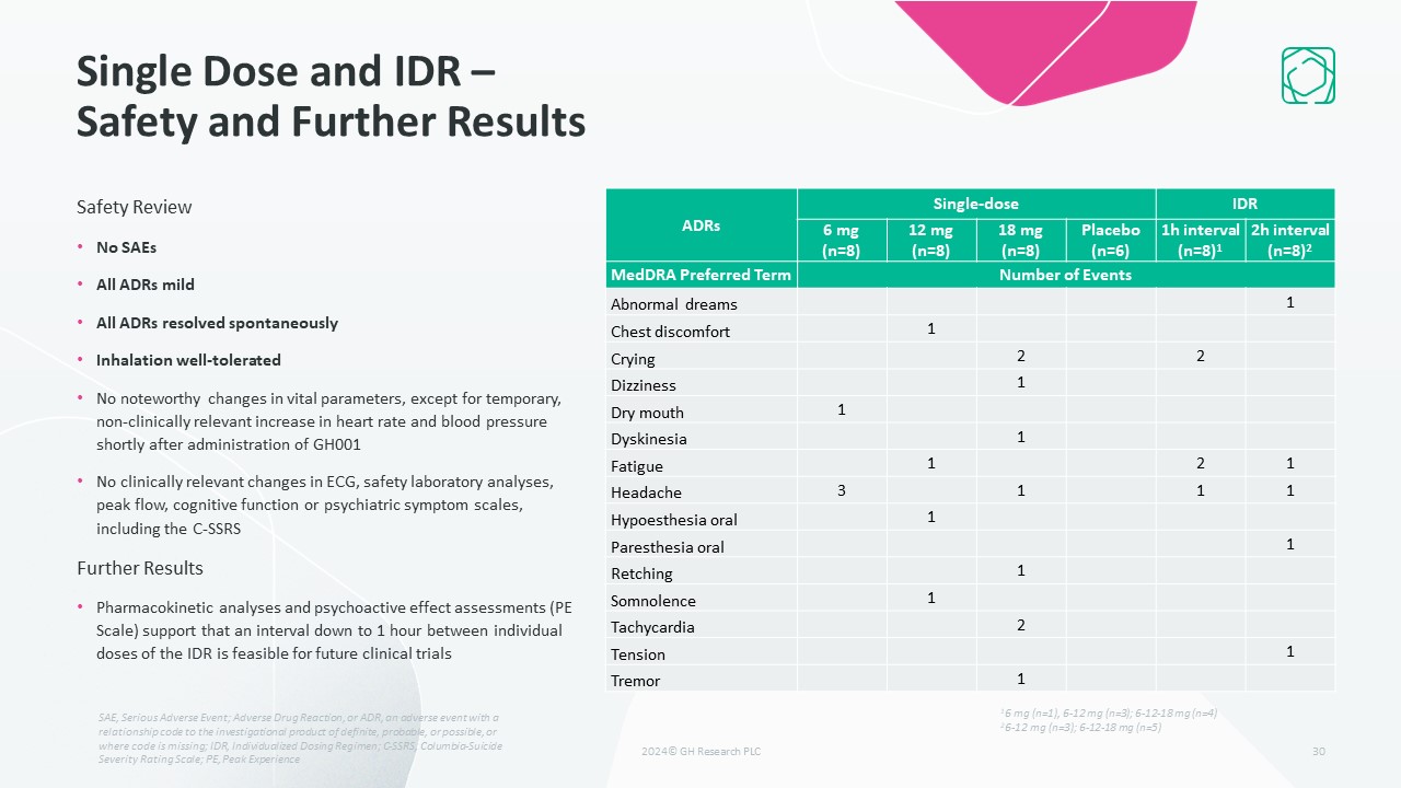 Single Dose and IDR – Safety and Further Results   Safety Review  No SAEs   All ADRs mild  All ADRs resolved spontaneously  Inhalation well-tolerated  No noteworthy changes in vital parameters, except for temporary, non-clinically relevant increase in heart rate and blood pressure shortly after administration of GH001  No clinically relevant changes in ECG, safety laboratory analyses, peak flow, cognitive function or psychiatric symptom scales, including the C-SSRS  Further Results  Pharmacokinetic analyses and psychoactive effect assessments (PE Scale) support that an interval down to 1 hour between individual doses of the IDR is feasible for future clinical trials  30  ADRs  Single-dose   IDR  6 mg (n=8)  12 mg (n=8)  18 mg (n=8)  Placebo (n=6)  1h interval (n=8)1  2h interval (n=8)2  MedDRA Preferred Term  Number of Events  n  n  n  n  n  Abnormal dreams  1  Chest discomfort     1        Crying        2     2     Dizziness     1     Dry mouth  1           Dyskinesia        1           Fatigue  1  2  1  Headache  3  1     1  1  Hypoesthesia oral  1        Paresthesia oral     1  Retching  1        Somnolence  1        Tachycardia  2     Tension     1  Tremor  1        SAE, Serious Adverse Event; Adverse Drug Reaction, or ADR, an adverse event with a relationship code to the investigational product of definite, probable, or possible, or where code is missing; IDR, Individualized Dosing Regimen; C-SSRS, Columbia-Suicide Severity Rating Scale; PE, Peak Experience  16 mg (n=1), 6-12 mg (n=3); 6-12-18 mg (n=4)26-12 mg (n=3); 6-12-18 mg (n=5)