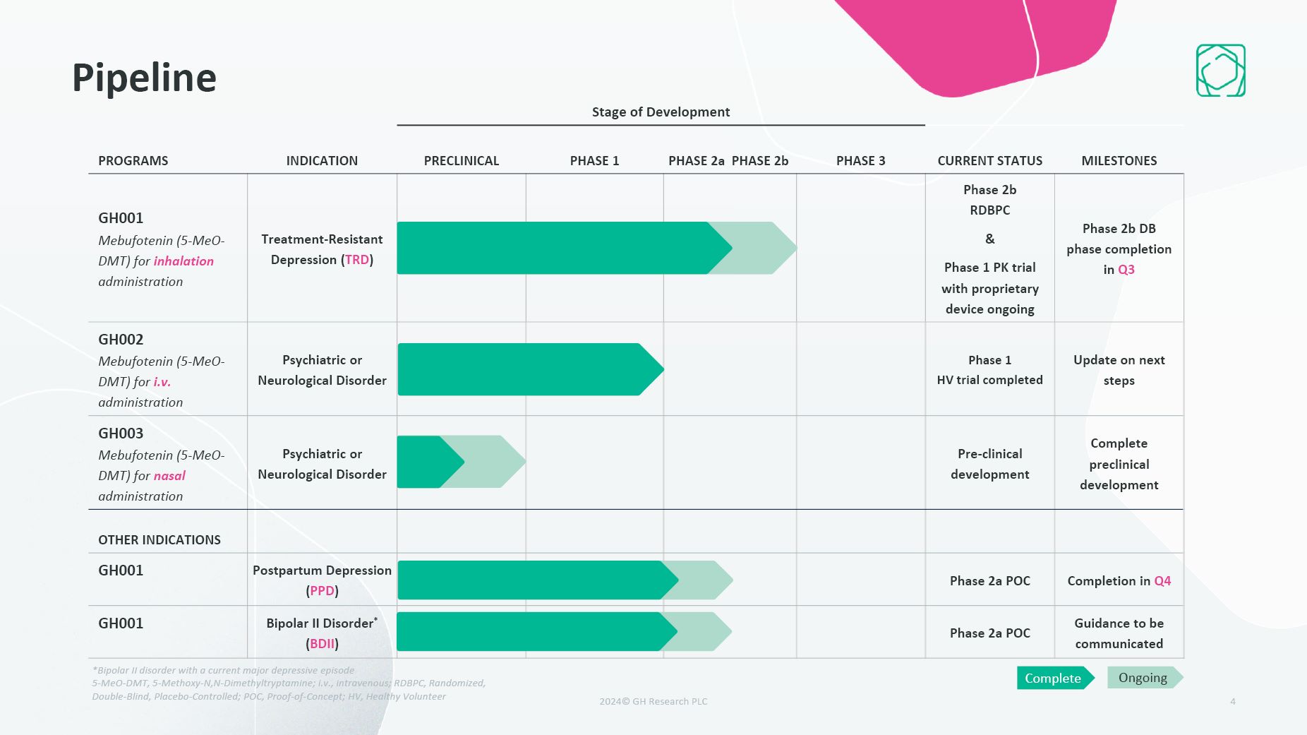Stage of Development  PROGRAMS  INDICATION  PRECLINICAL  PHASE 1  PHASE 2a PHASE 2b  PHASE 3  CURRENT STATUS  MILESTONES  GH001Mebufotenin (5-MeO-DMT) for inhalation administration   Treatment-Resistant Depression (TRD)  Phase 2b RDBPC  &  Phase 1 PK trial with proprietary device ongoing  Phase 2b DB phase completion in Q3  GH002Mebufotenin (5-MeO-DMT) for i.v. administration   Psychiatric or Neurological Disorder  Phase 1 HV trial completed  Update on next steps  GH003Mebufotenin (5-MeO-DMT) for nasal administration  Psychiatric or Neurological Disorder  Pre-clinical development  Complete preclinical development  OTHER INDICATIONS  GH001  Postpartum Depression (PPD)  Phase 2a POC  Completion in Q4  GH001  Bipolar II Disorder* (BDII)  Phase 2a POC  Guidance to be communicated  4  Complete  Ongoing  *Bipolar II disorder with a current major depressive episode  5-MeO-DMT, 5-Methoxy-N,N-Dimethyltryptamine; i.v., intravenous; RDBPC, Randomized, Double-Blind, Placebo-Controlled; POC, Proof-of-Concept; HV, Healthy Volunteer   Pipeline