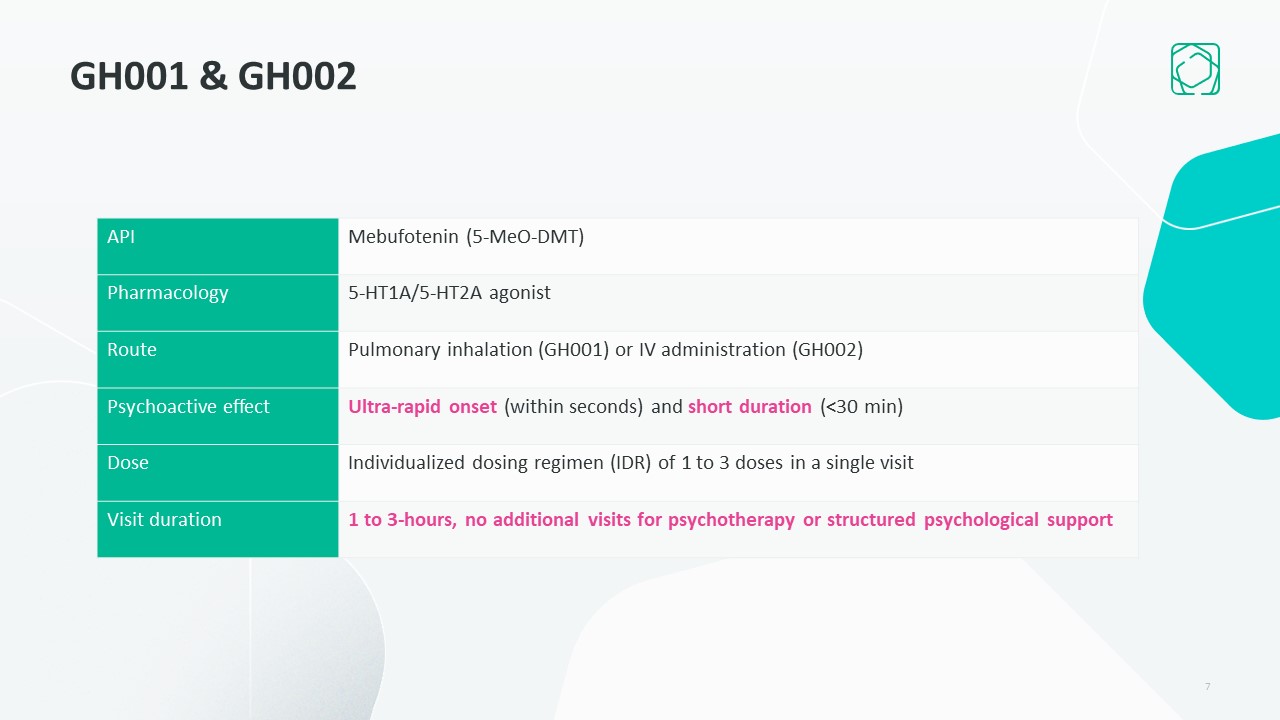 GH001 & GH002  7  API  Mebufotenin (5-MeO-DMT)  Pharmacology   5-HT1A/5-HT2A agonist  Route  Pulmonary inhalation (GH001) or IV administration (GH002)  Psychoactive effect  Ultra-rapid onset (within seconds) and short duration (<30 min)  Dose  Individualized dosing regimen (IDR) of 1 to 3 doses in a single visit  Visit duration  1 to 3-hours, no additional visits for psychotherapy or structured psychological support
