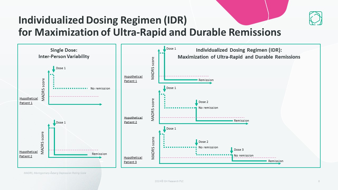 Individualized Dosing Regimen (IDR) for Maximization of Ultra-Rapid and Durable Remissions  8  Single Dose:  Inter-Person Variability  Individualized Dosing Regimen (IDR):Maximization of Ultra-Rapid and Durable Remissions   MADRS score  MADRS score  MADRS score  MADRS score  Dose 1  Dose 1  Dose 2  Dose 3  Dose 2  Dose 1  No remission  Remission  Remission  Remission  Remission  Hypothetical   Patient 1  Hypothetical   Patient 2  Hypothetical   Patient 3  Hypothetical   Patient 1  Hypothetical   Patient 2  No remission  No remission  No remission  Dose 1  MADRS score  Dose 1  MADRS, Montgomery-Åsberg Depression Rating Scale