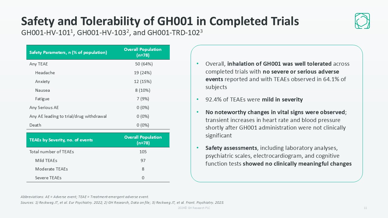 GH001-TRD-102 | Efficacy of the GH001 IDRPhase1/2 trial of GH001 in TRD (completed)  10  Abbreviations: MADRS = Montgomery–Åsberg Depression Rating Scale; IDR = Individualized dosing regimen  aBaseline mean MADRS = 32.  Sources: 1) Reckweg JT, et al. Front. Psychiatry. 2023.  Hour 2  Day 1  Day 7  GH001  p=0.0018  p<0.0001  p<0.0001  Baselinea  Key results1:  87.5% (7/8) patients achieved remission by Day 7  Mean change from baseline in MADRS score was -24.4 at day 7  2024© GH Research PLC