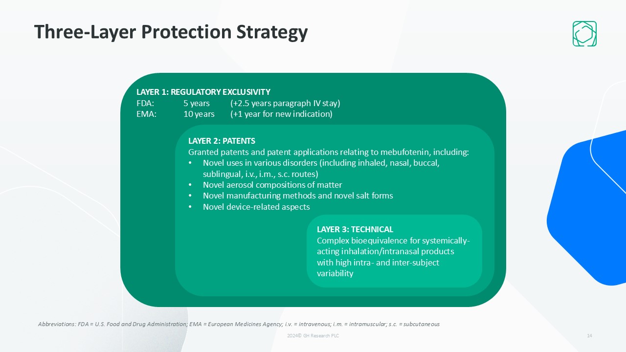 Three-Layer Protection Strategy  14  LAYER 1: REGULATORY EXCLUSIVITY  FDA: 5 years (+2.5 years paragraph IV stay)  EMA: 10 years (+1 year for new indication)  LAYER 2: PATENTS  Granted patents and patent applications relating to mebufotenin, including:   Novel uses in various disorders (including inhaled, nasal, buccal, sublingual, i.v., i.m., s.c. routes)   Novel aerosol compositions of matter  Novel manufacturing methods and novel salt forms   Novel device-related​ aspects  LAYER 3: TECHNICALComplex bioequivalence for systemically-acting inhalation/intranasal products with high intra- and inter-subject variability     Abbreviations: FDA = U.S. Food and Drug Administration; EMA = European Medicines Agency; i.v. = intravenous; i.m. = intramuscular; s.c. = subcutaneous