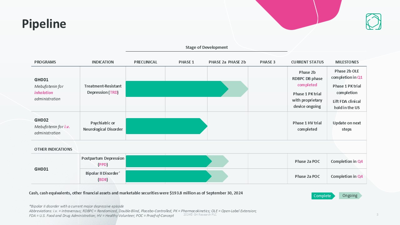 Stage of Development  PROGRAMS  INDICATION  PRECLINICAL  PHASE 1  PHASE 2a PHASE 2b  PHASE 3  CURRENT STATUS  MILESTONES  GH001Mebufotenin for inhalation administration   Treatment-Resistant Depression (TRD)  Phase 2b RDBPC DB phase completed  Phase 1 PK trial with proprietary device ongoing  Phase 2b OLE completion in Q1   Phase 1 PK trial completion  Lift FDA clinical hold in the US  GH002Mebufotenin for i.v. administration   Psychiatric or Neurological Disorder  Phase 1 HV trial completed  Update on next steps  OTHER INDICATIONS  GH001  Postpartum Depression (PPD)  Phase 2a POC  Completion in Q4  Bipolar II Disorder* (BDII)  Phase 2a POC  Completion in Q4  3  Complete  Ongoing  *Bipolar II disorder with a current major depressive episode  Abbreviations: i.v. = intravenous; RDBPC = Randomized, Double-Blind, Placebo-Controlled; PK = Pharmacokinetics; OLE = Open-Label Extension; FDA = U.S. Food and Drug Administration; HV = Healthy Volunteer; POC = Proof-of-Concept  Pipeline  Cash, cash equivalents, other financial assets and marketable securities were $193.8 million as of September 30, 2024