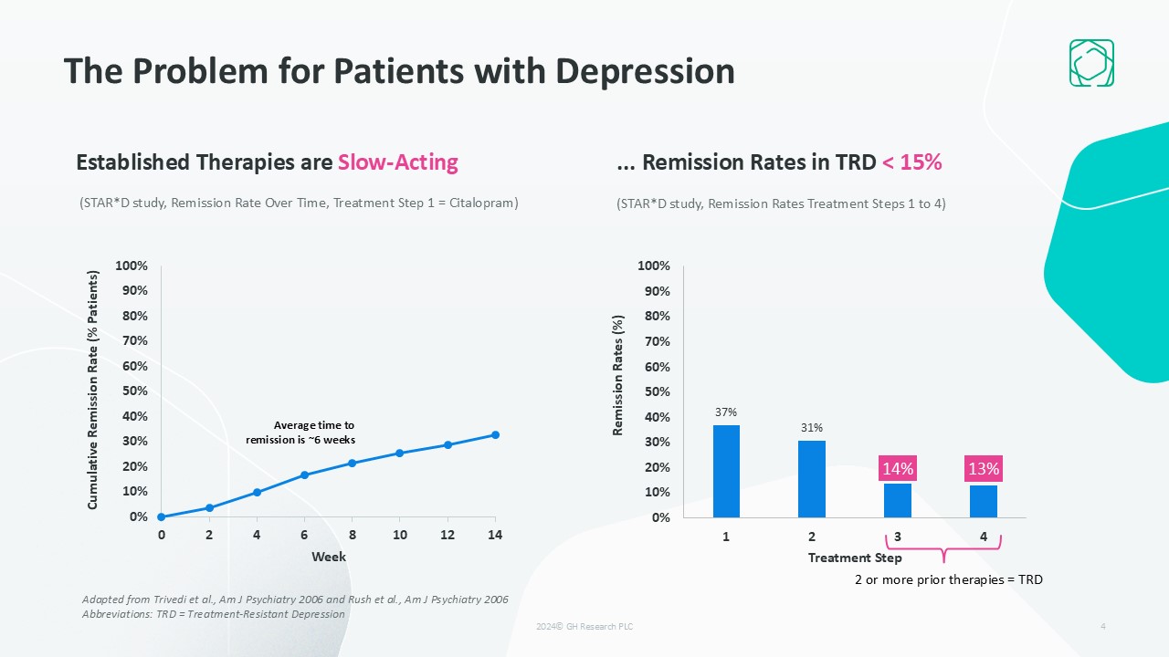 The Problem for Patients with Depression  Established Therapies are Slow-Acting  ... Remission Rates in TRD < 15%  4  (STAR*D study, Remission Rate Over Time, Treatment Step 1 = Citalopram)  (STAR*D study, Remission Rates Treatment Steps 1 to 4)  Average time to remission is ~6 weeks  2 or more prior therapies = TRD  Adapted from Trivedi et al., Am J Psychiatry 2006 and Rush et al., Am J Psychiatry 2006  Abbreviations: TRD = Treatment-Resistant Depression