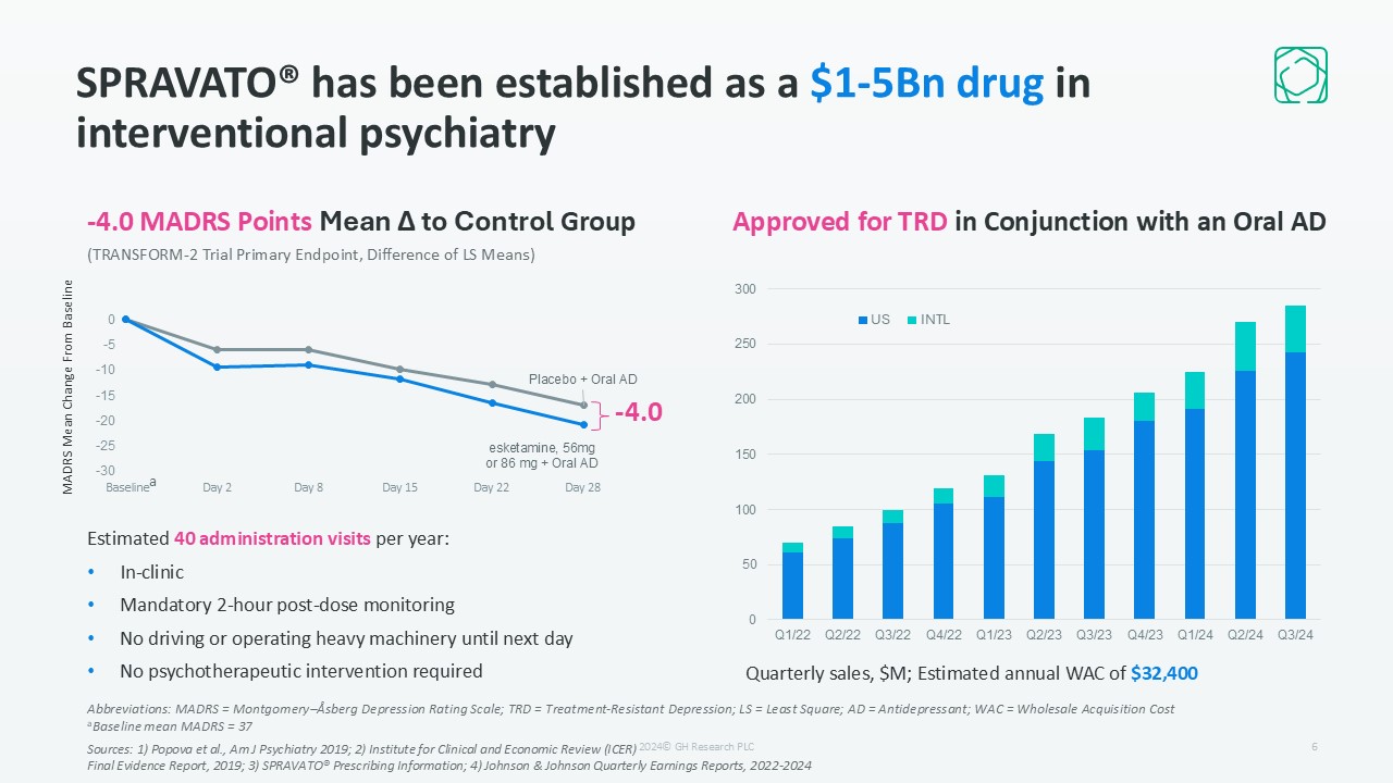 SPRAVATO® has been established as a $1-5Bn drug in interventional psychiatry  Quarterly sales, $M; Estimated annual WAC of $32,400  Estimated 40 administration visits per year:  In-clinic  Mandatory 2-hour post-dose monitoring  No driving or operating heavy machinery until next day  No psychotherapeutic intervention required  -4.0  Approved for TRD in Conjunction with an Oral AD  -4.0 MADRS Points Mean Δ to Control Group  Abbreviations: MADRS = Montgomery–Åsberg Depression Rating Scale; TRD = Treatment-Resistant Depression; LS = Least Square; AD = Antidepressant; WAC = Wholesale Acquisition Cost  aBaseline mean MADRS = 37  Sources: 1) Popova et al., Am J Psychiatry 2019; 2) Institute for Clinical and Economic Review (ICER)   Final Evidence Report, 2019; 3) SPRAVATO® Prescribing Information; 4) Johnson & Johnson Quarterly Earnings Reports, 2022-2024  a  (TRANSFORM-2 Trial Primary Endpoint, Difference of LS Means)  6