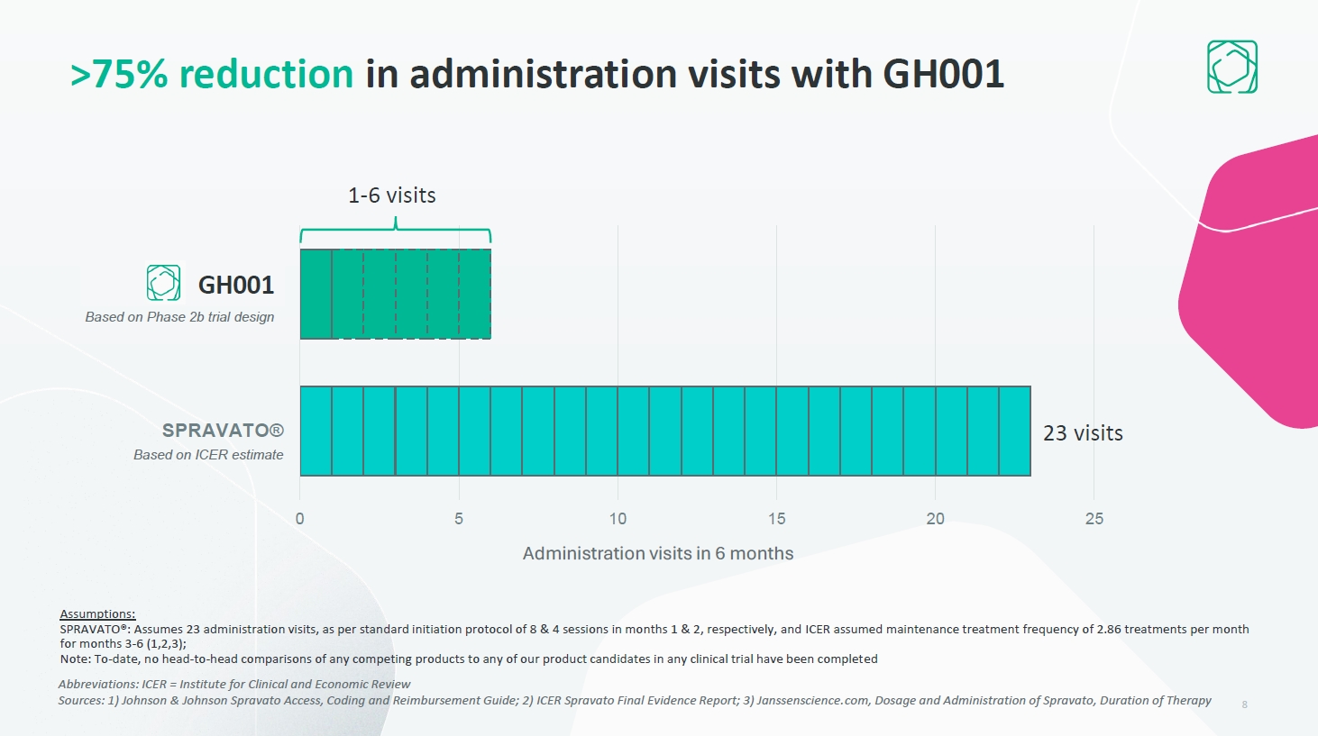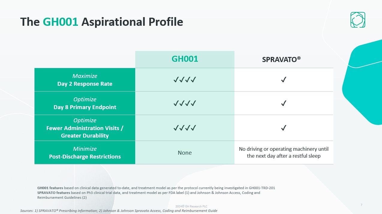 The GH001 Aspirational Profile  Maximize  Day 2 Response Rate  ✔✔✔✔  ✔  Maximize  Day 8 Response Rate  ✔✔✔✔  ✔  Minimize  In-Clinic, Post-Administration Monitoring  ≤ 1 hour  ≥ 2 hours  Minimize  Post-Discharge Restrictions  None   No driving or operating machinery until the next day after a restful sleep  Optimize  Fewer Administration Visits / Greater Durability  ✔✔✔✔  ✔  SPRAVATO®  GH001 features based on clinical data generated to-date, and treatment model as per the protocol currently being investigated in GH001-TRD-201  SPRAVATO features based on Ph3 clinical trial data, and treatment model as per FDA label (1) and Johnson & Johnson Access, Coding and Reimbursement Guidelines (2)  Sources: 1) SPRAVATO® Prescribing Information; 2) Johnson & Johnson Spravato Access, Coding and Reimbursement Guide  GH001  Treatment objectives  7  2024© GH Research PLC