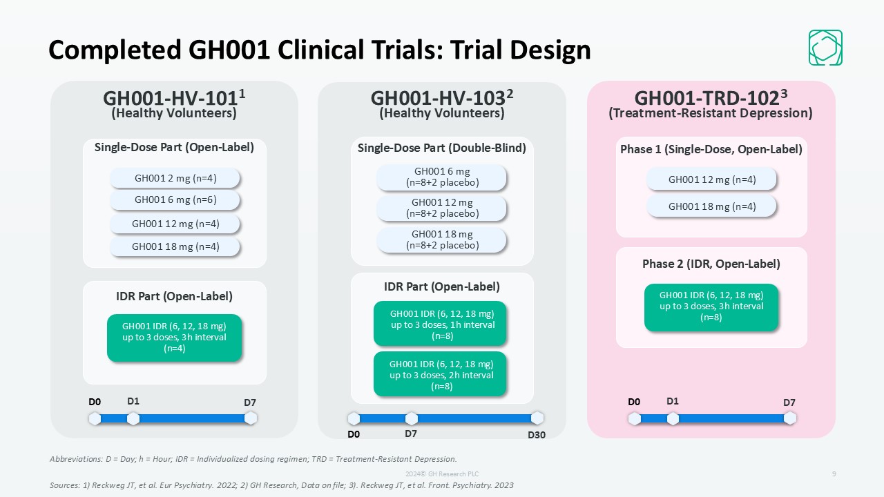 GH001-HV-1032  (Healthy Volunteers)  GH001 6 mg   (n=8+2 placebo)  GH001 12 mg   (n=8+2 placebo)  GH001 18 mg   (n=8+2 placebo)  GH001 IDR (6, 12, 18 mg)up to 3 doses, 1h interval (n=8)  GH001 IDR (6, 12, 18 mg)  up to 3 doses, 2h interval (n=8)  9  Completed GH001 Clinical Trials: Trial Design  GH001-HV-1011  (Healthy Volunteers)  IDR Part (Open-Label)  D1  D7  D0  GH001 IDR (6, 12, 18 mg)up to 3 doses, 3h interval  (n=4)  n=18  GH001 12 mg (n=4)  GH001 2 mg (n=4)  GH001 6 mg (n=6)  GH001 18 mg (n=4)  Single-Dose Part (Open-Label)  Single-Dose Part (Double-Blind)  IDR Part (Open-Label)  GH001-TRD-1023  (Treatment-Resistant Depression)  Phase 1 (Single-Dose, Open-Label)  Phase 2 (IDR, Open-Label)  GH001 12 mg (n=4)  GH001 18 mg (n=4)  GH001 IDR (6, 12, 18 mg)  up to 3 doses, 3h interval  (n=8)  Abbreviations: D = Day; h = Hour; IDR = Individualized dosing regimen; TRD = Treatment-Resistant Depression.   Sources: 1) Reckweg JT, et al. Eur Psychiatry. 2022; 2) GH Research, Data on file; 3). Reckweg JT, et al. Front. Psychiatry. 2023   D7  D30  D0  D1  D7  D0