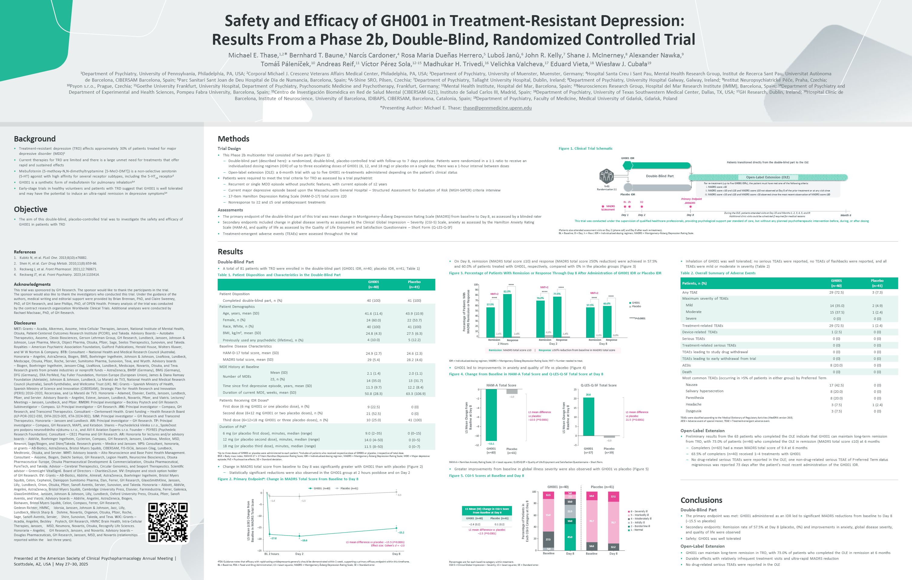 Safety and Efficacy of GH001 in Treatment-Resistant Depression: Results From a Phase 2b, Double-Blind, Randomized Controlled Trial  Michael E. Thase,1,2* Bernhard T. Baune,3 Narcís Cardoner,4 Rosa Maria Dueñas Herrero,5 Luboš Janů,6 John R. Kelly,7 Shane J. McInerney,8 Alexander Nawka,9 Tomáš Páleníček,10 Andreas Reif,11 Víctor Pérez Sola,12-15 Madhukar H. Trivedi,16 Velichka Valcheva,17 Eduard Vieta,18 Wiesław J. Cubała19  1Department of Psychiatry, University of Pennsylvania, Philadelphia, PA, USA; 2Corporal Michael J. Crescenz Veterans Affairs Medical Center, Philadelphia, PA, USA; 3Department of Psychiatry, University of Muenster, Muenster, Germany; 4Hospital Santa Creu i Sant Pau, Mental Health Research Group, Institut de Recerca Sant Pau, Universitat Autònoma de Barcelona, CIBERSAM Barcelona, Spain; 5Parc Sanitari Sant Joan de Deu Hospital de Dia de Numancia, Barcelona, Spain; 6A-Shine SRO, Pilsen, Czechia; 7Department of Psychiatry, Tallaght University Hospital, Dublin, Ireland; 8Department of Psychiatry, University Hospital Galway, Galway, Ireland; 9Institut Neuropsychiatrické Péče, Praha, Czechia;  10Psyon s.r.o., Prague, Czechia; 11Goethe University Frankfurt, University Hospital, Department of Psychiatry, Psychosomatic Medicine and Psychotherapy, Frankfurt, Germany; 12Mental Health Institute, Hospital del Mar, Barcelona, Spain; 13Neurosciences Research Group, Hospital del Mar Research Institute (IMIM), Barcelona, Spain; 14Department of Psychiatry and  Department of Experimental and Health Sciences, Pompeu Fabra University, Barcelona, Spain; 15Centro de Investigación Biomédica en Red de Salud Mental (CIBERSAM G21), Instituto de Salud Carlos III, Madrid, Spain; 16Department of Psychiatry, University of Texas Southwestern Medical Center, Dallas, TX, USA; 17GH Research, Dublin, Ireland; 18Hospital Clinic de Barcelona, Institute of Neuroscience, University of Barcelona, IDIBAPS, CIBERSAM, Barcelona, Catalonia, Spain; 19Department of Psychiatry, Faculty of Medicine, Medical University of Gdańsk, Gdańsk, Poland  *Presenting Author: Michael E. Thase; thase@pennmedicine.upenn.edu  Methods  Trial Design  This Phase 2b multicenter trial consisted of two parts (Figure 1):  Double-blind part (described here): a randomized, double-blind, placebo-controlled trial with follow-up to 7 days postdose. Patients were randomized in a 1:1 ratio to receive an individualized dosing regimen (IDR) of up to three escalating doses of GH001 (6, 12, and 18 mg) or placebo on a single day; there was a 1-hour interval between doses  Open-label extension (OLE): a 6-month trial with up to five GH001 re-treatments administered depending on the patient’s clinical status  Patients were required to meet the trial criteria for TRD as assessed by a trial psychiatrist:  Recurrent or single MDD episode without psychotic features, with current episode of ≤2 years  Current major depressive episode based upon the Massachusetts General Hospital – Structured Assessment for Evaluation of Risk (MGH-SAFER) criteria interview  17-Item Hamilton Depression Rating Scale (HAM-D-17) total score ≥20  Nonresponse to ≥2 and ≤5 oral antidepressant treatments  Assessments  The primary endpoint of the double-blind part of this trial was mean change in Montgomery–Åsberg Depression Rating Scale (MADRS) from baseline to Day 8, as assessed by a blinded rater  Secondary endpoints included change in global disease severity as assessed by the Clinical Global Impression – Severity (CGI-S) Scale, anxiety as assessed by the Hamilton Anxiety Rating Scale (HAM-A), and quality of life as assessed by the Quality of Life Enjoyment and Satisfaction Questionnaire – Short Form (Q-LES-Q-SF)  Treatment-emergent adverse events (TEAEs) were assessed throughout the trial  Background  Treatment-resistant depression (TRD) affects approximately 30% of patients treated for major depressive disorder (MDD)1  Current therapies for TRD are limited and there is a large unmet need for treatments that offer rapid and sustained effects  Mebufotenin (5-methoxy-N,N-dimethyltryptamine [5-MeO-DMT]) is a non-selective serotonin (5-HT) agonist with high affinity for several receptor subtypes, including the 5-HT1A receptor2  GH001 is a synthetic form of mebufotenin for pulmonary inhalation3,4  Early-stage trials in healthy volunteers and patients with TRD suggest that GH001 is well tolerated and may have the potential to induce an ultra-rapid remission in depressive symptoms3,4  Objective  The aim of this double-blind, placebo-controlled trial was to investigate the safety and efficacy of GH001 in patients with TRD  References  Kubitz N, et al. PLoS One. 2013;8(10):e76882.  Shen H, et al. Curr Drug Metab. 2010;11(8):659-66.  Reckweg J, et al. Front Pharmacol. 2021;12:760671.  Reckweg JT, et al. Front Psychiatry. 2023;14:1133414.  Acknowledgments  This trial was sponsored by GH Research. The sponsor would like to thank the participants in the trial.  The sponsor would also like to thank the investigators who conducted this trial. Under the guidance of the authors, medical writing and editorial support were provided by Brian Brennan, PhD, and Claire Sweeney, PhD, of GH Research, and Jane Phillips, PhD, of OPEN Health. Primary analysis of the trial was conducted by the contract research organization Worldwide Clinical Trials. Additional analyses were conducted by Rachael MacIsaac, PhD, of GH Research.  Disclosures  MET: Grants – Acadia, Alkermes, Axsome, Intra-Cellular Therapies, Janssen, National Institute of Mental Health, Otsuka, Patient-Centered Outcomes Research Institute (PCORI), and Takeda. Advisory Boards – Autobahn Therapeutics, Axsome, Clexio Biosciences, Gerson Lehrman Group, GH Research, Lundbeck, Janssen, Johnson & Johnson, Luye Pharma, Merck, Object Pharma, Otsuka, Pfizer, Sage, Seelos Therapeutics, Sunovion, and Takeda. Royalties – American Psychiatri