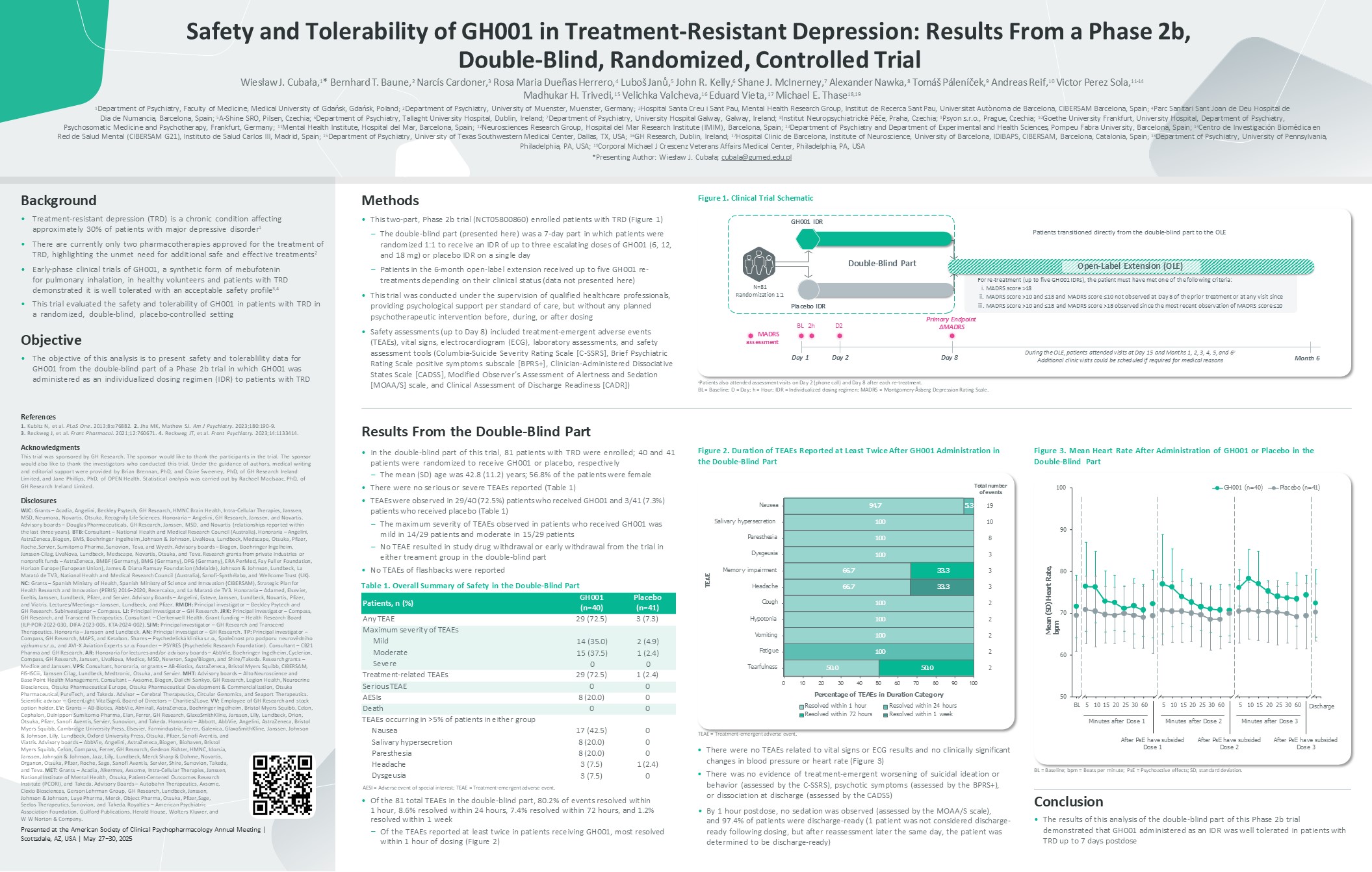 Safety and Tolerability of GH001 in Treatment-Resistant Depression: Results From a Phase 2b, Double-Blind, Randomized, Controlled Trial  Wiesław J. Cubała,1* Bernhard T. Baune,2 Narcís Cardoner,3 Rosa Maria Dueñas Herrero,4 Luboš Janů,5 John R. Kelly,6 Shane J. McInerney,7 Alexander Nawka,8 Tomáš Páleníček,9 Andreas Reif,10 Victor Perez Sola,11-14 Madhukar H. Trivedi,15 Velichka Valcheva,16 Eduard Vieta,17 Michael E. Thase18,19  1Department of Psychiatry, Faculty of Medicine, Medical University of Gdańsk, Gdańsk, Poland; 2Department of Psychiatry, University of Muenster, Muenster, Germany; 3Hospital Santa Creu i Sant Pau, Mental Health Research Group, Institut de Recerca Sant Pau, Universitat Autònoma de Barcelona, CIBERSAM Barcelona, Spain; 4Parc Sanitari Sant Joan de Deu Hospital de Dia de Numancia, Barcelona, Spain; 5A-Shine SRO, Pilsen, Czechia; 6Department of Psychiatry, Tallaght University Hospital, Dublin, Ireland; 7Department of Psychiatry, University Hospital Galway, Galway, Ireland; 8Institut Neuropsychiatrické Péče, Praha, Czechia; 9Psyon s.r.o., Prague, Czechia; 10Goethe University Frankfurt, University Hospital, Department of Psychiatry,  Psychosomatic Medicine and Psychotherapy, Frankfurt, Germany; 11Mental Health Institute, Hospital del Mar, Barcelona, Spain; 12Neurosciences Research Group, Hospital del Mar Research Institute (IMIM), Barcelona, Spain; 13Department of Psychiatry and Department of Experimental and Health Sciences, Pompeu Fabra University, Barcelona, Spain; 14Centro de Investigación Biomédica en  Red de Salud Mental (CIBERSAM G21), Instituto de Salud Carlos III, Madrid, Spain; 15Department of Psychiatry, University of Texas Southwestern Medical Center, Dallas, TX, USA; 16GH Research, Dublin, Ireland; 17Hospital Clinic de Barcelona, Institute of Neuroscience, University of Barcelona, IDIBAPS, CIBERSAM, Barcelona, Catalonia, Spain; 18Department of Psychiatry, University of Pennsylvania, Philadelphia, PA, USA; 19Corporal Michael J Crescenz Veterans Affairs Medical Center, Philadelphia, PA, USA  *Presenting Author: Wiesław J. Cubała; cubala@gumed.edu.pl  Methods  This two-part, Phase 2b trial (NCT05800860) enrolled patients with TRD (Figure 1)  The double-blind part (presented here) was a 7-day part in which patients were randomized 1:1 to receive an IDR of up to three escalating doses of GH001 (6, 12, and 18 mg) or placebo IDR on a single day  Patients in the 6-month open-label extension received up to five GH001 re- treatments depending on their clinical status (data not presented here)  This trial was conducted under the supervision of qualified healthcare professionals, providing psychological support per standard of care, but without any planned psychotherapeutic intervention before, during, or after dosing  Safety assessments (up to Day 8) included treatment-emergent adverse events (TEAEs), vital signs, electrocardiogram (ECG), laboratory assessments, and safety assessment tools (Columbia-Suicide Severity Rating Scale [C-SSRS], Brief Psychiatric Rating Scale positive symptoms subscale [BPRS+], Clinician-Administered Dissociative States Scale [CADSS], Modified Observer’s Assessment of Alertness and Sedation [MOAA/S] scale, and Clinical Assessment of Discharge Readiness [CADR])  Background  Treatment-resistant depression (TRD) is a chronic condition affecting approximately 30% of patients with major depressive disorder1  There are currently only two pharmacotherapies approved for the treatment of TRD, highlighting the unmet need for additional safe and effective treatments2  Early-phase clinical trials of GH001, a synthetic form of mebufotenin for pulmonary inhalation, in healthy volunteers and patients with TRD demonstrated it is well tolerated with an acceptable safety profile3,4  This trial evaluated the safety and tolerability of GH001 in patients with TRD in a randomized, double-blind, placebo-controlled setting  Objective  The objective of this analysis is to present safety and tolerablility data for GH001 from the double-blind part of a Phase 2b trial in which GH001 was administered as an individualized dosing regimen (IDR) to patients with TRD  Figure 1. Clinical Trial Schematic  aPatients also attended assessment visits on Day 2 (phone call) and Day 8 after each re-treatment.  BL = Baseline; D = Day; h = Hour; IDR = Individualized dosing regimen; MADRS = Montgomery-Åsberg Depression Rating Scale.  Results From the Double-Blind Part  In the double-blind part of this trial, 81 patients with TRD were enrolled; 40 and 41 patients were randomized to receive GH001 or placebo, respectively  The mean (SD) age was 42.8 (11.2) years; 56.8% of the patients were female  There were no serious or severe TEAEs reported (Table 1)  TEAEs were observed in 29/40 (72.5%) patients who received GH001 and 3/41 (7.3%) patients who received placebo (Table 1)  The maximum severity of TEAEs observed in patients who received GH001 was mild in 14/29 patients and moderate in 15/29 patients  No TEAE resulted in study drug withdrawal or early withdrawal from the trial in either treament group in the double-blind part  No TEAEs of flashbacks were reported  Table 1. Overall Summary of Safety in the Double-Blind Part  Patients, n (%)  GH001 (n=40)  Placebo (n=41)  Any TEAE  29 (72.5)  3 (7.3)  Maximum severity of TEAEs Mild  Moderate Severe  14 (35.0)  15 (37.5)  0  2 (4.9)  1 (2.4)  0  Treatment-related TEAEs 29 (72.5) 1 (2.4)  Serious TEAE 0 0  AESIs 8 (20.0) 0  Death 0 0  17 (42.5)  8 (20.0)  8 (20.0)  3 (7.5)  3 (7.5)  0  0  0  1 (2.4)  0  TEAEs occurring in >5% of patients in either group Nausea  Salivary hypersecretion Paresthesia  Headache Dysgeusia  AESI = Adverse event of special interest; TEAE = Treatment-emergent adverse event.  Of the 81 total TEAEs in the double-blind part, 80.2% of events resolved within 1 hour, 8.6% resolv