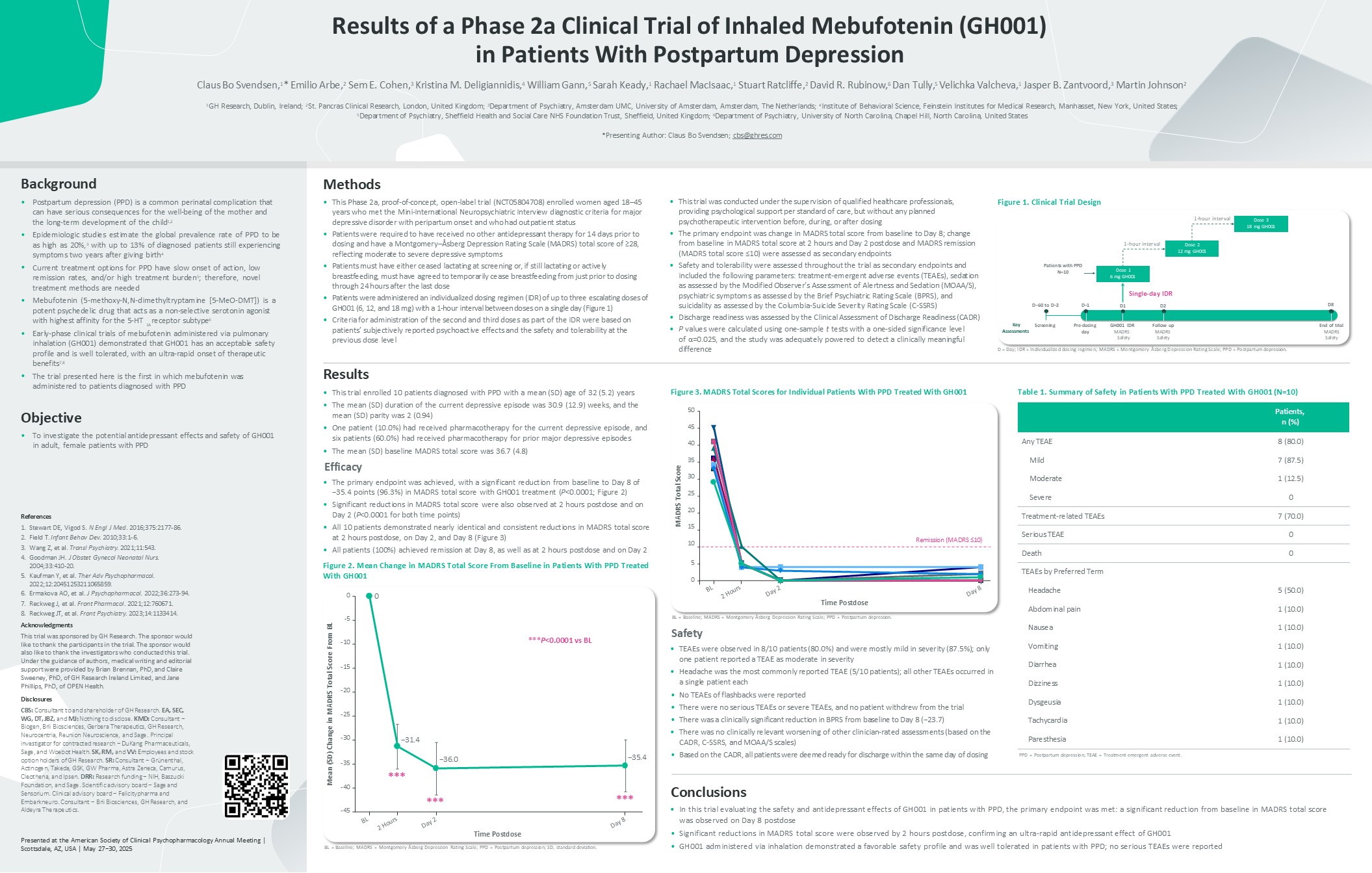 Results of a Phase 2a Clinical Trial of Inhaled Mebufotenin (GH001) in Patients With Postpartum Depression  Claus Bo Svendsen,1* Emilio Arbe,2 Sem E. Cohen,3 Kristina M. Deligiannidis,4 William Gann,5 Sarah Keady,1 Rachael MacIsaac,1 Stuart Ratcliffe,2 David R. Rubinow,6 Dan Tully,5 Velichka Valcheva,1 Jasper B. Zantvoord,3 Martin Johnson2  1GH Research, Dublin, Ireland; 2St. Pancras Clinical Research, London, United Kingdom; 3Department of Psychiatry, Amsterdam UMC, University of Amsterdam, Amsterdam, The Netherlands; 4Institute of Behavioral Science, Feinstein Institutes for Medical Research, Manhasset, New York, United States;  5Department of Psychiatry, Sheffield Health and Social Care NHS Foundation Trust, Sheffield, United Kingdom; 6Department of Psychiatry, University of North Carolina, Chapel Hill, North Carolina, United States  *Presenting Author: Claus Bo Svendsen; cbs@ghres.com  Presented at the American Society of Clinical Psychopharmacology Annual Meeting | Scottsdale, AZ, USA | May 27−30, 2025  Methods  This Phase 2a, proof-of-concept, open-label trial (NCT05804708) enrolled women aged 18–45 years who met the Mini-International Neuropsychiatric Interview diagnostic criteria for major depressive disorder with peripartum onset and who had outpatient status  Patients were required to have received no other antidepressant therapy for 14 days prior to dosing and have a Montgomery–Åsberg Depression Rating Scale (MADRS) total score of ≥28, reflecting moderate to severe depressive symptoms  Patients must have either ceased lactating at screening or, if still lactating or actively breastfeeding, must have agreed to temporarily cease breastfeeding from just prior to dosing through 24 hours after the last dose  Patients were administered an individualized dosing regimen (IDR) of up to three escalating doses of GH001 (6, 12, and 18 mg) with a 1-hour interval between doses on a single day (Figure 1)  Criteria for administration of the second and third doses as part of the IDR were based on patients’ subjectively reported psychoactive effects and the safety and tolerability at the previous dose level  Background  •  •  Postpartum depression (PPD) is a common perinatal complication that can have serious consequences for the well-being of the mother and the long-term development of the child1,2  Epidemiologic studies estimate the global prevalence rate of PPD to be as high as 20%,3 with up to 13% of diagnosed patients still experiencing symptoms two years after giving birth4  Current treatment options for PPD have slow onset of action, low remission rates, and/or high treatment burden5; therefore, novel treatment methods are needed  Mebufotenin (5-methoxy-N,N-dimethyltryptamine [5-MeO-DMT]) is a potent psychedelic drug that acts as a non-selective serotonin agonist  with highest affinity for the 5-HT receptor subtype6  •  1A  Early-phase clinical trials of mebufotenin administered via pulmonary inhalation (GH001) demonstrated that GH001 has an acceptable safety profile and is well tolerated, with an ultra-rapid onset of therapeutic benefits7,8  The trial presented here is the first in which mebufotenin was administered to patients diagnosed with PPD  Objective  To investigate the potential antidepressant effects and safety of GH001 in adult, female patients with PPD  Results  This trial enrolled 10 patients diagnosed with PPD with a mean (SD) age of 32 (5.2) years  The mean (SD) duration of the current depressive episode was 30.9 (12.9) weeks, and the mean (SD) parity was 2 (0.94)  One patient (10.0%) had received pharmacotherapy for the current depressive episode, and six patients (60.0%) had received pharmacotherapy for prior major depressive episodes  The mean (SD) baseline MADRS total score was 36.7 (4.8)  Efficacy  The primary endpoint was achieved, with a significant reduction from baseline to Day 8 of  −35.4 points (96.3%) in MADRS total score with GH001 treatment (P<0.0001; Figure 2)  Significant reductions in MADRS total score were also observed at 2 hours postdose and on Day 2 (P<0.0001 for both time points)  All 10 patients demonstrated nearly identical and consistent reductions in MADRS total score at 2 hours postdose, on Day 2, and Day 8 (Figure 3)  All patients (100%) achieved remission at Day 8, as well as at 2 hours postdose and on Day 2  Figure 2. Mean Change in MADRS Total Score From Baseline in Patients With PPD Treated With GH001  BL = Baseline; MADRS = Montgomery-Åsberg Depression Rating Scale; PPD = Postpartum depression; SD, standard deviation.  Figure 3. MADRS Total Scores for Individual Patients With PPD Treated With GH001  BL = Baseline; MADRS = Montgomery-Åsberg Depression Rating Scale; PPD = Postpartum depression.  Safety  TEAEs were observed in 8/10 patients (80.0%) and were mostly mild in severity (87.5%); only one patient reported a TEAE as moderate in severity  Headache was the most commonly reported TEAE (5/10 patients); all other TEAEs occurred in a single patient each  No TEAEs of flashbacks were reported  There were no serious TEAEs or severe TEAEs, and no patient withdrew from the trial  There was a clinically significant reduction in BPRS from baseline to Day 8 (−23.7)  There was no clinically relevant worsening of other clinician-rated assessments (based on the CADR, C-SSRS, and MOAA/S scales)  Based on the CADR, all patients were deemed ready for discharge within the same day of dosing  Table 1. Summary of Safety in Patients With PPD Treated With GH001 (N=10)  Patients, n (%)  Any TEAE  8 (80.0)  Mild  7 (87.5)  Moderate  1 (12.5)  Severe  0  Treatment-related TEAEs  7 (70.0)  Serious TEAE  0  Death  0  TEAEs by Preferred Term  Headache  5 (50.0)  Abdominal pain  1 (10.0)  Nausea  1 (10.0)  Vomiting  1 (10.0)  Diarrhea  1 (10.0)  Dizziness  1 (10.0)  Dysgeusia  1 (10.0) 