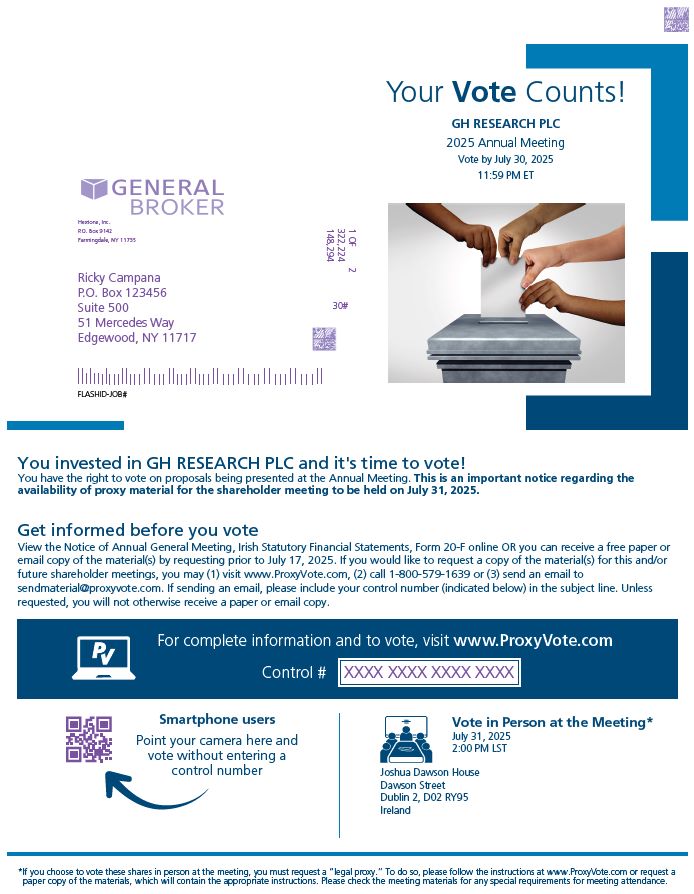 You invested in GH RESEARCH PLC and it’s time to vote!  You have the right to vote on proposals being presented at the Annual Meeting. This is an important notice regarding the availability of proxy material for the shareholder meeting to be held on July 31, 2025.  Get informed before you vote  View the Notice of Annual General Meeting, Irish Statutory Financial Statements, Form 20-F online OR you can receive a free paper or email copy of the material(s) by requesting prior to July 17, 2025. If you would like to request a copy of the material(s) for this and/or future shareholder meetings, you may (1) visit www.ProxyVote.com, (2) call 1-800-579-1639 or (3) send an email to sendmaterial@proxyvote.com. If sending an email, please include your control number (indicated below) in the subject line. Unless requested, you will not otherwise receive a paper or email copy.  *If you choose to vote these shares in person at the meeting, you must request a “legal proxy.” To do so, please follow the instructions at www.ProxyVote.com or request a paper copy of the materials, which will contain the appropriate instructions. Please check the meeting materials for any special requirements for meeting attendance.  Smartphone users  Point your camera here and vote without entering a control number  Your Vote Counts!  FLASHID-JOB#  For complete information and to vote, visit www.ProxyVote.com  Control #  Ricky Campana  P.O. Box 123456  Suite 500  51 Mercedes Way  Edgewood, NY 11717  1 OF  322,224  148,294  2  30#  Hextone, Inc.  P.O. Box 9142  Farmingdale, NY 11735  XXXX XXXX XXXX XXXX  GH RESEARCH PLC  2025 Annual Meeting  Vote by July 30, 2025  11:59 PM ET  Vote in Person at the Meeting*  July 31, 2025  2:00 PM LST  Joshua Dawson House Dawson Street  Dublin 2, D02 RY95 Ireland