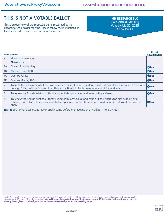 Voting Items  Board Recommends  1. Election of Directors  Nominees:  1A Florian Schonharting  For  1B Michael Forer, LL.B.  For  1C Dermot Hanley  For  1D Duncan Moore, PhD  For  2. To ratify the appointment of PricewaterhouseCoopers Ireland as independent auditors of the Company for the year ending 31 December 2025 and to authorise the Board to fix the remuneration of the auditors.  For  3. To renew the Boards existing authority under Irish law to allot and issue ordinary shares.  For  4. To renew the Boards existing authority under Irish law to allot and issue ordinary shares for cash without first offering those shares to existing shareholders pursuant to the statutory pre-emption right that would otherwise apply.  For  NOTE: Such other business as may properly come before the meeting or any adjournment thereof.  THIS IS NOT A VOTABLE BALLOT  This is an overview of the proposals being presented at the upcoming shareholder meeting. Please follow the instructions on the reverse side to vote these important matters.  Vote at www.ProxyVote.com  FLASHID-JOB#  Control # XXXX XXXX XXXX XXXX  1.00000  322,224  148,294  Under New York Stock Exchange rules, brokers may vote “routine” matters at their discretion if your voting instructions are not communicated to us at least 10 days before the meeting. We will nevertheless follow your instructions, even if the broker’s discretionary vote has already been given, provided your instructions are received prior to the meeting date.  GH RESEARCH PLC  2025 Annual Meeting  Vote by July 30, 2025  11:59 PM ET