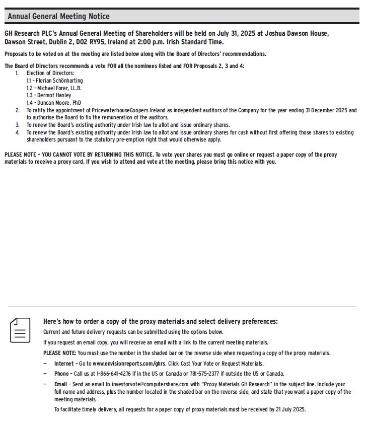Here’s how to order a copy of the proxy materials and select delivery preferences:  Current and future delivery requests can be submitted using the options below.  If you request an email copy, you will receive an email with a link to the current meeting materials.  PLEASE NOTE: You must use the number in the shaded bar on the reverse side when requesting a copy of the proxy materials.  Internet – Go to www.envisionreports.com/ghrs. Click Cast Your Vote or Request Materials.  Phone – Call us at 1-866-641-4276 if in the US or Canada or 781-575-2377 if outside the US or Canada.  Email – Send an email to investorvote@computershare.com with “Proxy Materials GH Research” in the subject line. Include your full name and address, plus the number located in the shaded bar on the reverse side, and state that you want a paper copy of the meeting materials.  To facilitate timely delivery, all requests for a paper copy of proxy materials must be received by 21 July 2025.  Annual General Meeting Notice  GH Research PLC’s Annual General Meeting of Shareholders will be held on July 31, 2025 at Joshua Dawson House, Dawson Street, Dublin 2, D02 RY95, Ireland at 2:00 p.m. Irish Standard Time.  Proposals to be voted on at the meeting are listed below along with the Board of Directors’ recommendations. The Board of Directors recommends a vote FOR all the nominees listed and FOR Proposals 2, 3 and 4:  Election of Directors:  - Florian Schönharting  - Michael Forer, LL.B.  - Dermot Hanley  - Duncan Moore, PhD  To ratify the appointment of PricewaterhouseCoopers Ireland as independent auditors of the Company for the year ending 31 December 2025 and to authorise the Board to fix the remuneration of the auditors.  To renew the Board’s existing authority under Irish law to allot and issue ordinary shares.  To renew the Board’s existing authority under Irish law to allot and issue ordinary shares for cash without first offering those shares to existing shareholders pursuant to the statutory pre-emption right that would otherwise apply.  PLEASE NOTE – YOU CANNOT VOTE BY RETURNING THIS NOTICE. To vote your shares you must go online or request a paper copy of the proxy materials to receive a proxy card. If you wish to attend and vote at the meeting, please bring this notice with you.